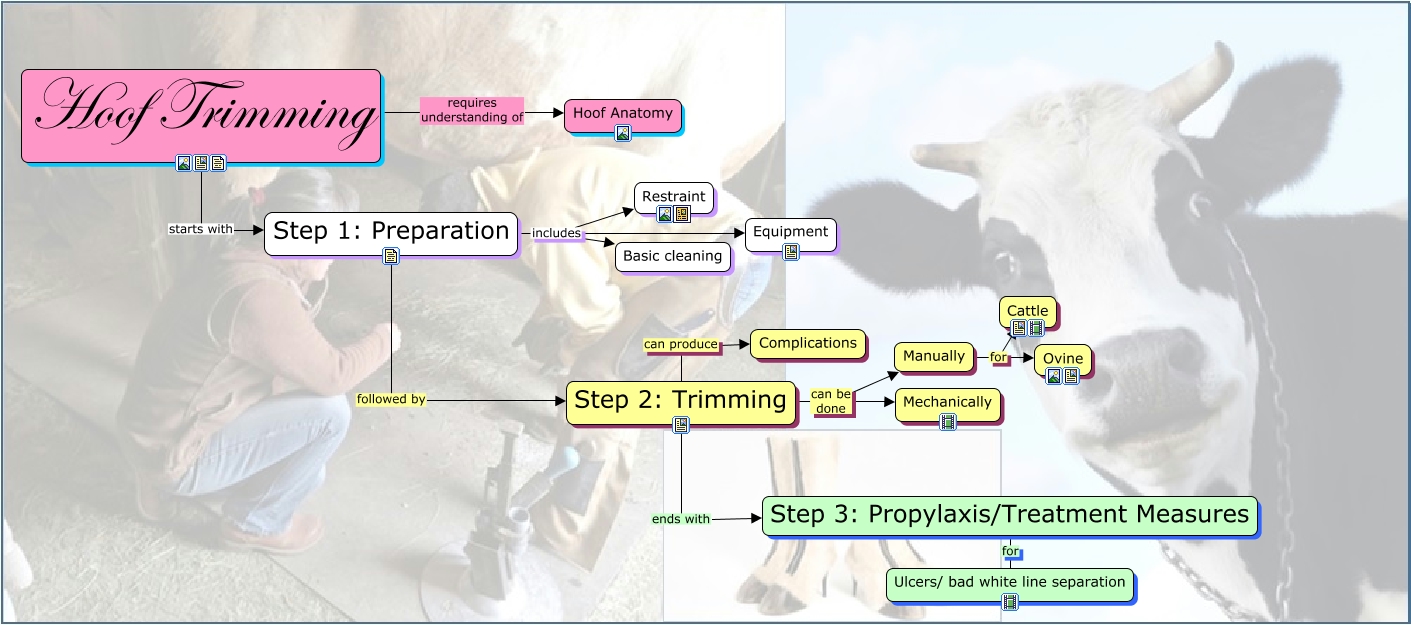 This Concept Map, created with IHMC CmapTools, has information related to: Lab 3 - Hoof trimming, Step 1: Preparation followed by Step 2: Trimming, Step 1: Preparation includes Equipment, Hoof Trimming requires understanding of Hoof Anatomy, Step 2: Trimming ends with Step 3: Propylaxis/Treatment Measures, Step 2: Trimming can be done Manually, Hoof Trimming starts with Step 1: Preparation, Step 1: Preparation includes Restraint, Step 2: Trimming can produce Complications, Step 2: Trimming can be done Mechanically, Step 3: Propylaxis/Treatment Measures for Ulcers/ bad white line separation, Manually for Ovine, Manually for Cattle, Step 1: Preparation includes Basic cleaning
