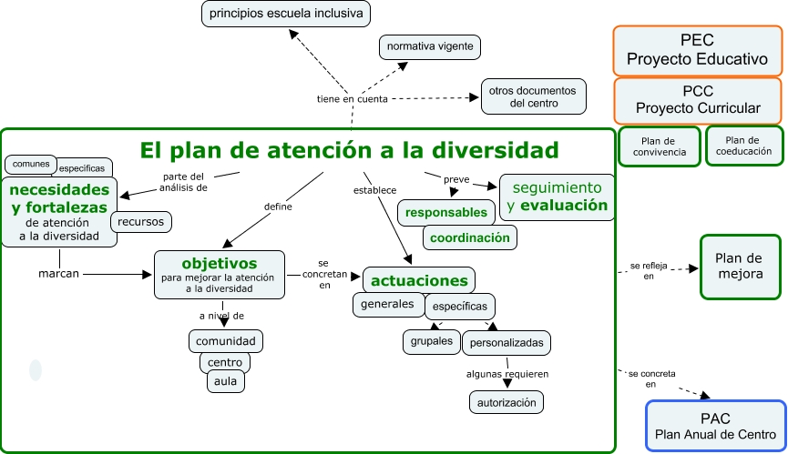 Este Cmap, tiene información relacionada con: pad8, El plan de atención a la diversidad preve seguimiento y evaluación, El plan de atención a la diversidad tiene en cuenta otros documentos del centro, específicas ???? grupales, se concreta en PAC Plan Anual de Centro, El plan de atención a la diversidad tiene en cuenta normativa vigente, El plan de atención a la diversidad preve responsables, El plan de atención a la diversidad tiene en cuenta principios escuela inclusiva, El plan de atención a la diversidad define objetivos para mejorar la atención a la diversidad, específicas ???? personalizadas, El plan de atención a la diversidad parte del análisis de necesidades y fortalezas de atención a la diversidad, objetivos para mejorar la atención a la diversidad se concretan en actuaciones, objetivos para mejorar la atención a la diversidad a nivel de comunidad, necesidades y fortalezas de atención a la diversidad marcan objetivos para mejorar la atención a la diversidad, El plan de atención a la diversidad establece actuaciones, se refleja en Plan de mejora, personalizadas algunas requieren autorización