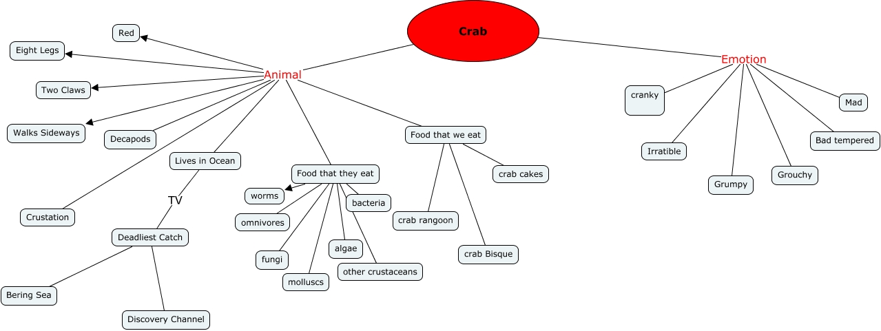 This Concept Map, created with IHMC CmapTools, has information related to: Kelsie and Nick, Deadliest Catch Discovery Channel, Food that they eat other crustaceans, Crab Emotion Irratible, Crab Animal Food that we eat, Crab Emotion Grumpy, Crab Animal Food that they eat, Food that we eat crab cakes, Food that they eat omnivores, Crab Emotion Grouchy, Crab Animal Crustation, Crab Animal Red, Food that they eat worms, Food that they eat bacteria, Deadliest Catch Bering Sea, Crab Animal Two Claws, Crab Emotion Bad tempered, Food that we eat crab rangoon, Crab Animal Decapods, Food that we eat crab Bisque, Food that they eat algae