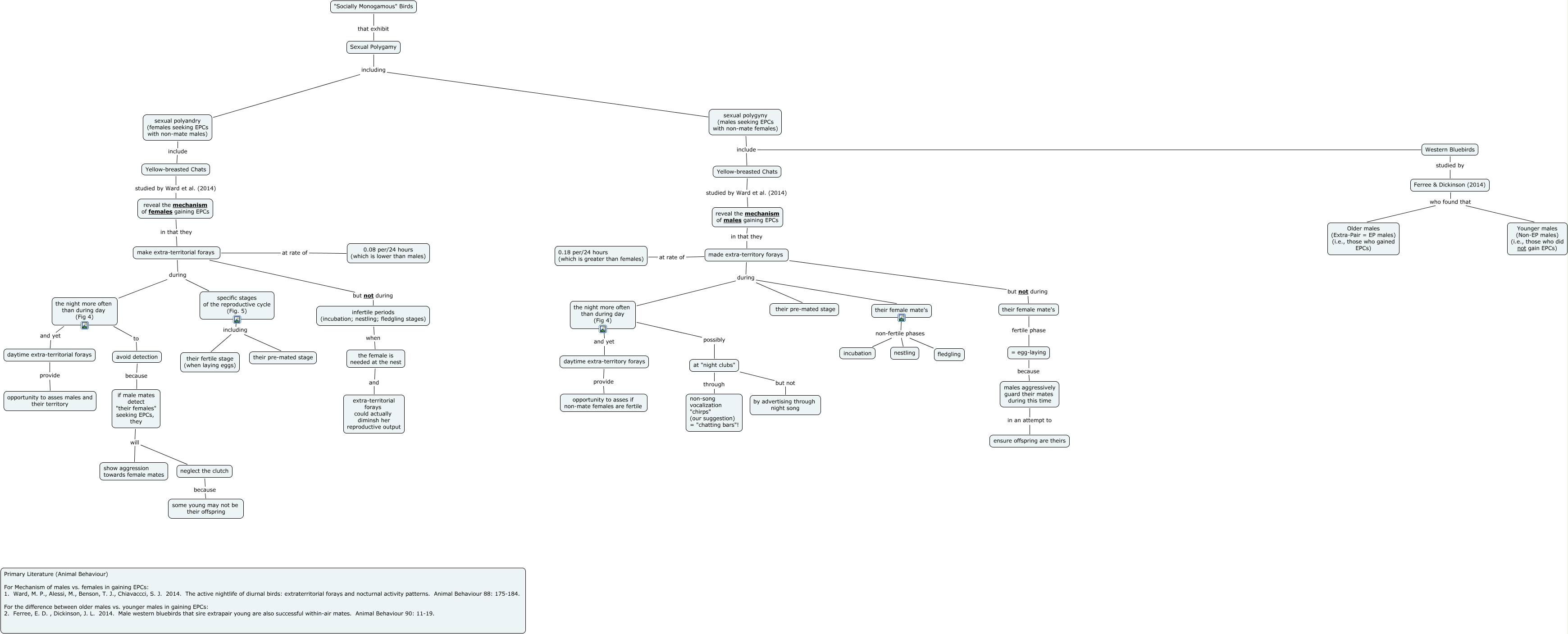 This Concept Map, created with IHMC CmapTools, has information related to: mating systems Lit, made extra-territory forays during the night more often than during day (Fig 4), at "night clubs" but not by advertising through night song, make extra-territorial forays but not during infertile periods (incubation; nestling; fledgling stages), the night more often than during day (Fig 4) and yet daytime extra-territory forays, specific stages of the reproductive cycle (Fig. 5) including their pre-mated stage, made extra-territory forays at rate of 0.18 per/24 hours (which is greater than females), sexual polygyny (males seeking EPCs with non-mate females) include Western Bluebirds, daytime extra-territory forays provide opportunity to asses if non-mate females are fertile, neglect the clutch because some young may not be their offspring, made extra-territory forays but not during their female mate's, males aggressively guard their mates during this time in an attempt to ensure offspring are theirs, their female mate's non-fertile phases fledgling, specific stages of the reproductive cycle (Fig. 5) including their fertile stage (when laying eggs), Ferree & Dickinson (2014) who found that Older males (Extra-Pair = EP males) (i.e., those who gained EPCs), Yellow-breasted Chats studied by Ward et al. (2014) reveal the mechanism of females gaining EPCs, the night more often than during day (Fig 4) and yet daytime extra-territorial forays, Sexual Polygamy including sexual polyandry (females seeking EPCs with non-mate males), = egg-laying because males aggressively guard their mates during this time, infertile periods (incubation; nestling; fledgling stages) when the female is needed at the nest, daytime extra-territorial forays provide opportunity to asses males and their territory