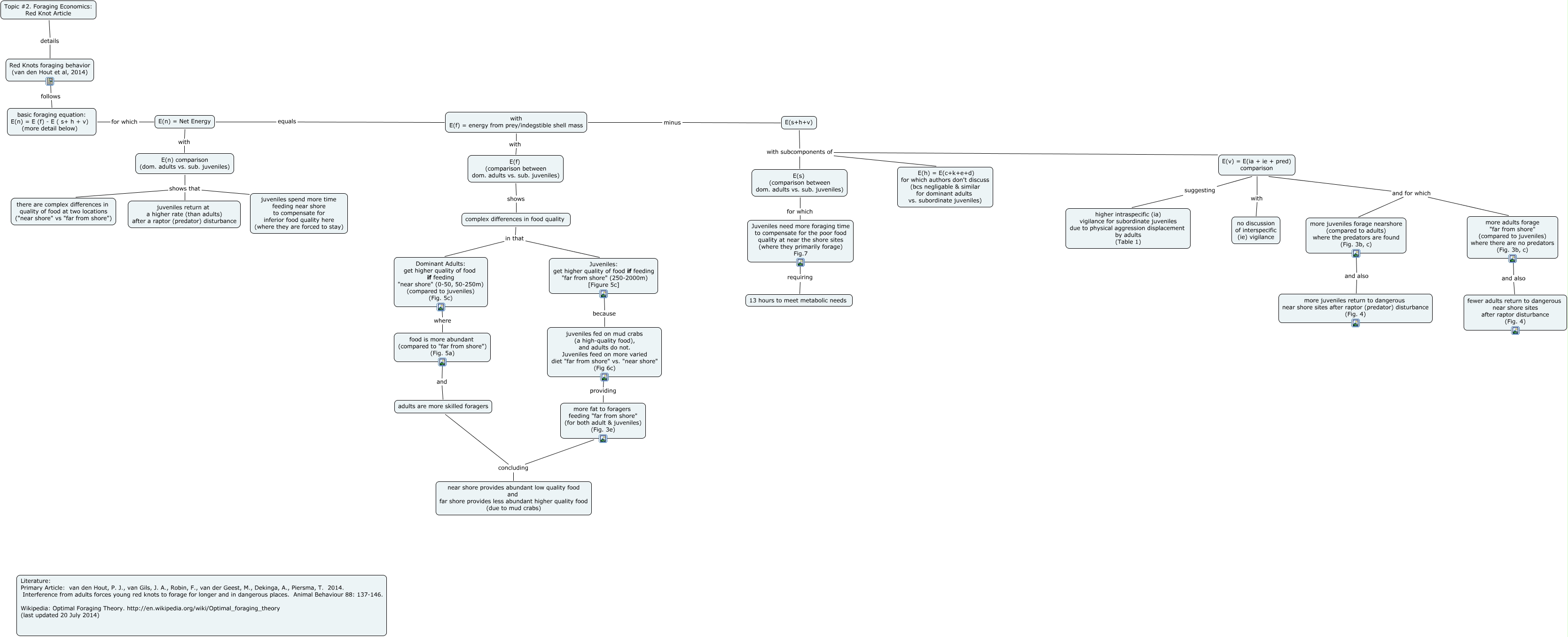 This Concept Map, created with IHMC CmapTools, has information related to: Topic 2. Red Knot Article (Equation), E(v) = E(ia + ie + pred) comparison suggesting higher intraspecific (ia) vigilance for subordinate juveniles due to physical aggression displacement by adults (Table 1), juveniles fed on mud crabs (a high-quality food), and adults do not. Juveniles feed on more varied diet "far from shore" vs. "near shore" (Fig 6c) providing more fat to foragers feeding "far from shore" (for both adult & juveniles) (Fig. 3e), E(v) = E(ia + ie + pred) comparison and for which more juveniles forage nearshore (compared to adults) where the predators are found (Fig. 3b, c), complex differences in food quality in that Dominant Adults: get higher quality of food if feeding "near shore" (0-50, 50-250m) (compared to juveniles) (Fig. 5c), more juveniles forage nearshore (compared to adults) where the predators are found (Fig. 3b, c) and also more juveniles return to dangerous near shore sites after raptor (predator) disturbance (Fig. 4), Topic #2. Foraging Economics: Red Knot Article details Red Knots foraging behavior (van den Hout et al, 2014), complex differences in food quality in that Juveniles: get higher quality of food if feeding "far from shore" (250-2000m) [Figure 5c], E(v) = E(ia + ie + pred) comparison and for which more adults forage "far from shore" (compared to juveniles) where there are no predators (Fig. 3b, c), E(n) = Net Energy with E(n) comparison (dom. adults vs. sub. juveniles), adults are more skilled foragers concluding near shore provides abundant low quality food and far shore provides less abundant higher quality food (due to mud crabs), E(s+h+v) with subcomponents of E(v) = E(ia + ie + pred) comparison, E(s+h+v) with subcomponents of E(s) (comparison between dom. adults vs. sub. juveniles), E(s) (comparison between dom. adults vs. sub. juveniles) for which Juveniles need more foraging time to compensate for the poor food quality at near the shore sites (where they primarily forage) Fig.7, with E(f) = energy from prey/indegstible shell mass minus E(s+h+v), E(f) (comparison between dom. adults vs. sub. juveniles) shows complex differences in food quality, Juveniles need more foraging time to compensate for the poor food quality at near the shore sites (where they primarily forage) Fig.7 requiring 13 hours to meet metabolic needs, E(n) = Net Energy equals with E(f) = energy from prey/indegstible shell mass, Red Knots foraging behavior (van den Hout et al, 2014) follows basic foraging equation: E(n) = E (f) - E ( s+ h + v) (more detail below), E(n) comparison (dom. adults vs. sub. juveniles) shows that juveniles return at a higher rate (than adults) after a raptor (predator) disturbance, E(s+h+v) with subcomponents of E(h) = E(c+k+e+d) for which authors don't discuss (bcs negligable & similar for dominant adults vs. subordinate juveniles)