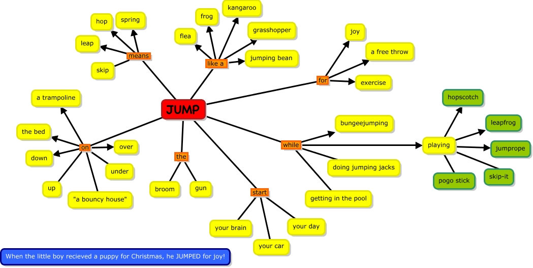 This Concept Map, created with IHMC CmapTools, has information related to: Brianna H., Lindsey, and Natasha's Map, JUMP on over, JUMP for joy, JUMP on "a bouncy house", JUMP while playing, JUMP means skip, JUMP means hop, JUMP the gun, JUMP means spring, JUMP like a frog, JUMP while doing jumping jacks, JUMP like a grasshopper, playing pogo stick, JUMP like a flea, JUMP on up, JUMP for exercise, JUMP the broom, JUMP on under, JUMP on down, JUMP start your day, JUMP start your brain