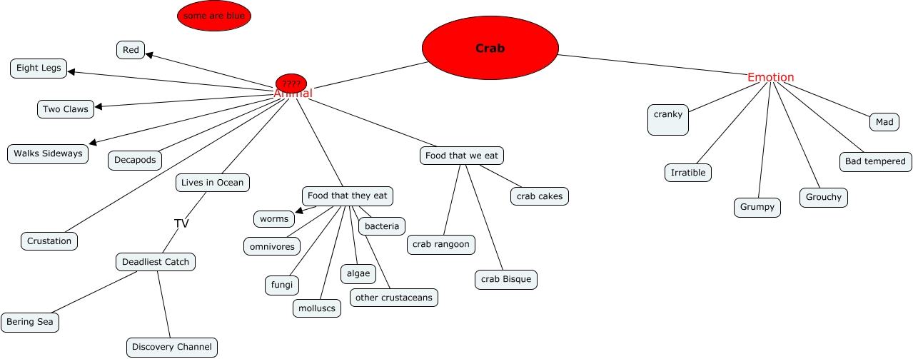This Concept Map, created with IHMC CmapTools, has information related to: Kelsie and Nick and Nouelle, Crab Emotion Bad tempered, Crab Animal Two Claws, Food that we eat crab rangoon, Crab Emotion Grouchy, Food that they eat molluscs, Crab Animal Walks Sideways, Food that they eat other crustaceans, Food that we eat crab cakes, Crab Emotion Grumpy, Crab Emotion cranky, Deadliest Catch Bering Sea, Lives in Ocean TV Deadliest Catch, Crab Emotion Irratible, Crab Animal Food that we eat, Crab Emotion Mad, Crab Animal Crustation, Crab Animal Lives in Ocean, Food that they eat omnivores, Food that they eat fungi, Crab Animal Eight Legs