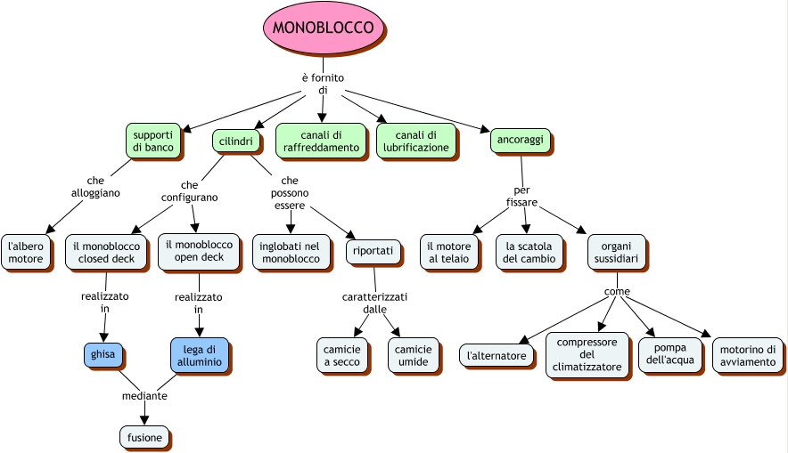 Questa Cmap, creata con IHMC CmapTools, contiene informazioni relative a: Monoblocco, ancoraggi per fissare la scatola del cambio, organi sussidiari come l'alternatore, organi sussidiari come motorino di avviamento, MONOBLOCCO è fornito di supporti di banco, ghisa mediante fusione, il monoblocco closed deck realizzato in ghisa, cilindri che possono essere inglobati nel monoblocco, lega di alluminio mediante fusione, il monoblocco open deck realizzato in lega di alluminio, MONOBLOCCO è fornito di cilindri, ancoraggi per fissare il motore al telaio, cilindri che configurano il monoblocco open deck, supporti di banco che alloggiano l'albero motore, organi sussidiari come pompa dell'acqua, MONOBLOCCO è fornito di canali di lubrificazione, ancoraggi per fissare organi sussidiari, MONOBLOCCO è fornito di ancoraggi, riportati caratterizzati dalle camicie umide, riportati caratterizzati dalle camicie a secco, MONOBLOCCO è fornito di canali di raffreddamento