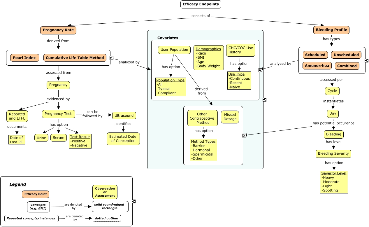 This Concept Map, created with IHMC CmapTools, has information related to: Contraceptives Efficacy Framework - v8-1, ???? assessed per Cycle, Cycle instantiates Day, Bleeding Profile has types ????, Pregnancy evidenced by Reported and LTFU, Pregnancy Rate derived from ????, CHC/COC Use History has option Use Type -Continuous -Recent -Naive, Pregnancy evidenced by Pregnancy Test, Pregnancy Test has option Test Result -Positive -Negative, ???? analyzed by ????, Other Contraceptive Method has option Method Types -Barrier -Hormonal -Spermicidal -Other, Bleeding has level Bleeding Severity, Reported and LTFU documents Date of Last Pill, Day has potential occurence Bleeding, Pregnancy Test has option Urine, Bleeding Severity has option Severity Level -Heavy -Moderate -Light -Spotting, ???? analyzed by ????, Concepts (e.g. BMI) are denoted by solid round-edged rectangle, ???? assessed from Pregnancy, Pregnancy Test has option Serum, Day has potential occurence ????