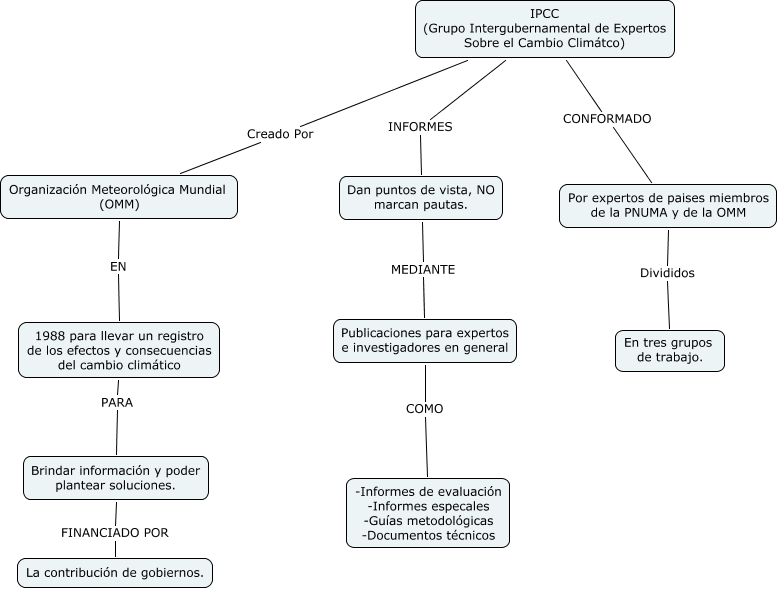 Este Cmap, tiene información relacionada con: Intro, Organización Meteorológica Mundial (OMM) EN 1988 para llevar un registro de los efectos y consecuencias del cambio climático, IPCC (Grupo Intergubernamental de Expertos Sobre el Cambio Climátco) CONFORMADO Por expertos de paises miembros de la PNUMA y de la OMM, IPCC (Grupo Intergubernamental de Expertos Sobre el Cambio Climátco) INFORMES Dan puntos de vista, NO marcan pautas., Dan puntos de vista, NO marcan pautas. MEDIANTE Publicaciones para expertos e investigadores en general, 1988 para llevar un registro de los efectos y consecuencias del cambio climático PARA Brindar información y poder plantear soluciones., IPCC (Grupo Intergubernamental de Expertos Sobre el Cambio Climátco) Creado Por Organización Meteorológica Mundial (OMM), Brindar información y poder plantear soluciones. FINANCIADO POR La contribución de gobiernos., Por expertos de paises miembros de la PNUMA y de la OMM Divididos En tres grupos de trabajo., Publicaciones para expertos e investigadores en general COMO -Informes de evaluación -Informes especales -Guías metodológicas -Documentos técnicos