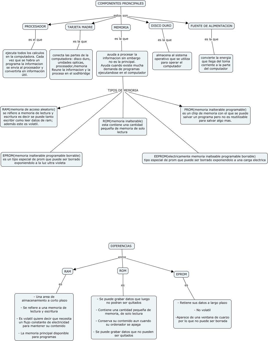 This Concept Map, created with IHMC CmapTools, has information related to: gaby, ayuda a procesar la informacion sin embargo no es la principal. Ayuda cuando existe mucha demanda de programas ejecutandose en el computador TIPOS DE MEMORIA ROM(memoria inalterable) esta contiene una cantidad pequeña de memoria de solo lectura, DIFERENCIAS entre RAM, PROCESADOR es el que ejecuta todos los calculos en la computadora. Cada vez que se habra un programa la informacion se envia al procesador y convertirla en información útil., FUENTE DE ALIMENTACION es la que convierte la energia que llega del toma corriente a la parte del computador, COMPONENTES PRONCIPALES estos son MEMORIA, MEMORIA es la que ayuda a procesar la informacion sin embargo no es la principal. Ayuda cuando existe mucha demanda de programas ejecutandose en el computador, ayuda a procesar la informacion sin embargo no es la principal. Ayuda cuando existe mucha demanda de programas ejecutandose en el computador TIPOS DE MEMORIA EPROM(memoria inalterable programable borrable) es un tipo especial de prom que puede ser borrado exponiendolo a la luz ultra violeta, COMPONENTES PRONCIPALES estos son DISCO DURO, COMPONENTES PRONCIPALES estos son FUENTE DE ALIMENTACION, ROM es - Se puede grabar datos que luego no podran ser quitados - Contiene una cantidad pequeña de memoria, de solo lectura - Conserva su contenido aun cuando su ordenador se apaga - Se puede grabar datos que no pueden ser quitados, RAM es - Una area de almacenamiento a corto plazo - Se refiere a una memoria de lectura y escritura - Es volatil quiere decir que necesita un flujo constante de electricidad para mantener su contenido - La memoria principal disponible para programas, EPROM es - Retiene sus datos a largo plazo - No volatil -Aparece de una ventana de cuarzo por lo que no puede ser borrada, ayuda a procesar la informacion sin embargo no es la principal. Ayuda cuando existe mucha demanda de programas ejecutandose en el computador TIPOS DE MEMORIA PROM(memoria inalterable programable) es un chip de memoria con el que se puede salvar un programa pero no es reutilizable para salvar algo mas., DIFERENCIAS entre EPROM, TARJETA MADRE es la que conecta las partes de la computadora: disco duro, unidades opticas, procesador,memoria Reune la informacion y la procesa en el sodhbridge, ayuda a procesar la informacion sin embargo no es la principal. Ayuda cuando existe mucha demanda de programas ejecutandose en el computador TIPOS DE MEMORIA EEPROM(electricamente memoria inalteable programable borrable) tipo especial de prom que puede ser borrado exponiendolo a una carga electrica, COMPONENTES PRONCIPALES estos son TARJETA MADRE, DIFERENCIAS entre ROM, COMPONENTES PRONCIPALES estos son PROCESADOR, ayuda a procesar la informacion sin embargo no es la principal. Ayuda cuando existe mucha demanda de programas ejecutandose en el computador TIPOS DE MEMORIA RAM(memoria de acceso aleatorio) se refiere a memoria de lectura y escritura es decir se puede tanto escribir como leer datos de ram; además este es volatil.