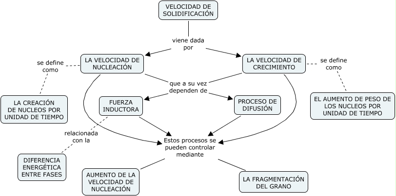 Este Cmap, tiene información relacionada con: Velocidad de solidificación, LA VELOCIDAD DE NUCLEACIÓN se define como LA CREACIÓN DE NUCLEOS POR UNIDAD DE TIEMPO, FUERZA INDUCTORA relacionada con la DIFERENCIA ENERGÉTICA ENTRE FASES, LA VELOCIDAD DE CRECIMIENTO se define como EL AUMENTO DE PESO DE LOS NUCLEOS POR UNIDAD DE TIEMPO, LA VELOCIDAD DE NUCLEACIÓN Estos procesos se pueden controlar mediante AUMENTO DE LA VELOCIDAD DE NUCLEACIÓN, LA VELOCIDAD DE NUCLEACIÓN que a su vez dependen de FUERZA INDUCTORA, LA VELOCIDAD DE CRECIMIENTO que a su vez dependen de FUERZA INDUCTORA, VELOCIDAD DE SOLIDIFICACIÓN viene dada por LA VELOCIDAD DE CRECIMIENTO, LA VELOCIDAD DE CRECIMIENTO que a su vez dependen de PROCESO DE DIFUSIÓN, VELOCIDAD DE SOLIDIFICACIÓN viene dada por LA VELOCIDAD DE NUCLEACIÓN, PROCESO DE DIFUSIÓN Estos procesos se pueden controlar mediante LA FRAGMENTACIÓN DEL GRANO, LA VELOCIDAD DE CRECIMIENTO Estos procesos se pueden controlar mediante LA FRAGMENTACIÓN DEL GRANO, PROCESO DE DIFUSIÓN Estos procesos se pueden controlar mediante AUMENTO DE LA VELOCIDAD DE NUCLEACIÓN, FUERZA INDUCTORA Estos procesos se pueden controlar mediante AUMENTO DE LA VELOCIDAD DE NUCLEACIÓN, LA VELOCIDAD DE NUCLEACIÓN Estos procesos se pueden controlar mediante LA FRAGMENTACIÓN DEL GRANO, LA VELOCIDAD DE CRECIMIENTO Estos procesos se pueden controlar mediante AUMENTO DE LA VELOCIDAD DE NUCLEACIÓN, LA VELOCIDAD DE NUCLEACIÓN que a su vez dependen de PROCESO DE DIFUSIÓN, FUERZA INDUCTORA Estos procesos se pueden controlar mediante LA FRAGMENTACIÓN DEL GRANO