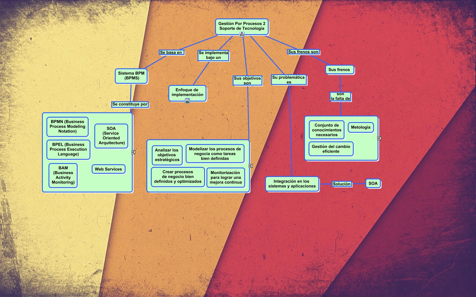 Este Cmap, tiene información relacionada con: Gestión por Procesos.Tecnología, Integración en los sistemas y aplicaciones Solución SOA, Gestión Por Procesos 2 Soporte de Tecnología Sus objetivos son Objetivos, Sus frenos son la falta de Limitaciones, Gestión Por Procesos 2 Soporte de Tecnología Se basa en Sistema BPM (BPMS), Gestión Por Procesos 2 Soporte de Tecnología Sus frenos son Sus frenos, Gestión Por Procesos 2 Soporte de Tecnología Se implementa bajo un Enfoque de implementación, Sistema BPM (BPMS) Se constituye por Elementos, Gestión Por Procesos 2 Soporte de Tecnología Su problemática es Integración en los sistemas y aplicaciones