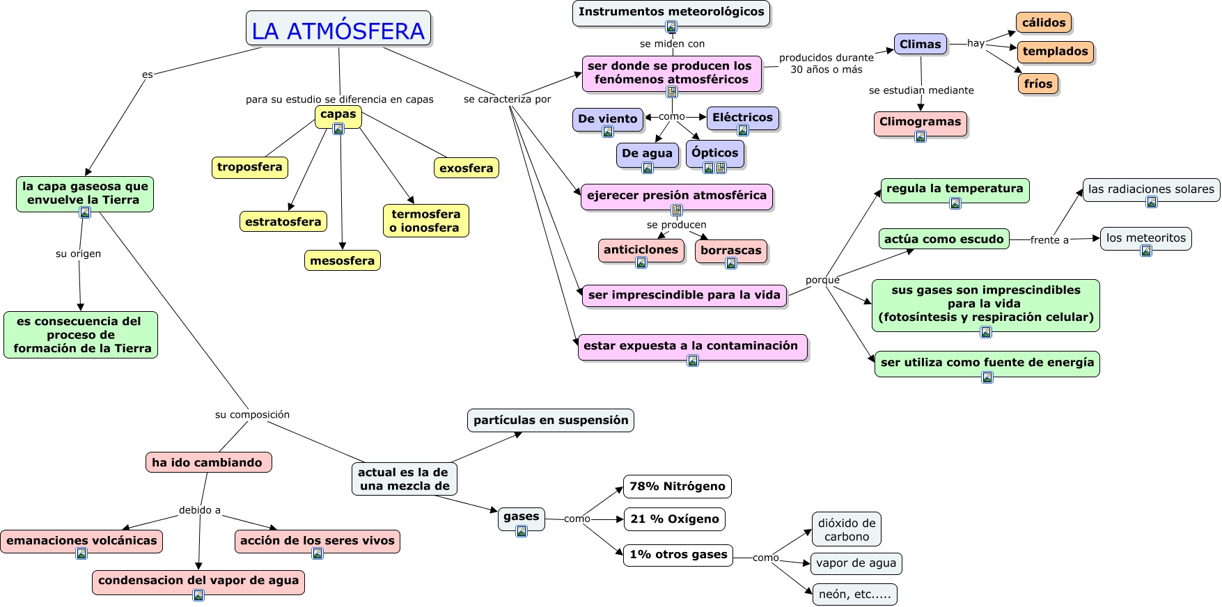 Este Cmap, tiene información relacionada con: la atmósfera, LA ATMÓSFERA es la capa gaseosa que envuelve la Tierra, Climas hay fríos, LA ATMÓSFERA para su estudio se diferencia en capas estratosfera, ser donde se producen los fenómenos atmosféricos se miden con Instrumentos meteorológicos, LA ATMÓSFERA para su estudio se diferencia en capas termosfera o ionosfera, ser donde se producen los fenómenos atmosféricos producidos durante 30 años o más Climas, LA ATMÓSFERA para su estudio se diferencia en capas troposfera, gases como 21 % Oxígeno, gases como 78% Nitrógeno, actual es la de una mezcla de ???? gases, ser donde se producen los fenómenos atmosféricos como Ópticos, LA ATMÓSFERA se caracteriza por estar expuesta a la contaminación, la capa gaseosa que envuelve la Tierra su origen es consecuencia del proceso de formación de la Tierra, ser donde se producen los fenómenos atmosféricos como De agua, LA ATMÓSFERA para su estudio se diferencia en capas mesosfera, LA ATMÓSFERA se caracteriza por ser donde se producen los fenómenos atmosféricos, ejerecer presión atmosférica se producen anticiclones, Climas hay cálidos, LA ATMÓSFERA para su estudio se diferencia en capas exosfera, la capa gaseosa que envuelve la Tierra su composición actual es la de una mezcla de