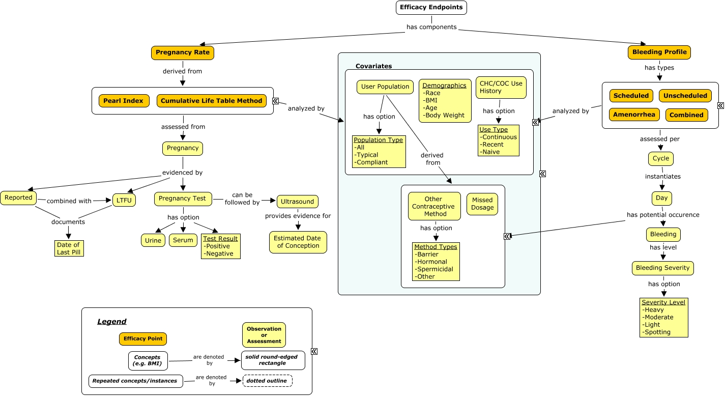 This Concept Map, created with IHMC CmapTools, has information related to: Contraceptives Efficacy Framework - v9, ???? assessed per Cycle, Cycle instantiates Day, Bleeding Profile has types ????, Pregnancy evidenced by LTFU, Pregnancy Rate derived from ????, CHC/COC Use History has option Use Type -Continuous -Recent -Naive, Reported combined with LTFU, Pregnancy evidenced by Pregnancy Test, Pregnancy Test has option Test Result -Positive -Negative, ???? analyzed by ????, Other Contraceptive Method has option Method Types -Barrier -Hormonal -Spermicidal -Other, Bleeding has level Bleeding Severity, LTFU documents Date of Last Pill, Day has potential occurence Bleeding, Pregnancy Test has option Urine, Bleeding Severity has option Severity Level -Heavy -Moderate -Light -Spotting, ???? analyzed by ????, Concepts (e.g. BMI) are denoted by solid round-edged rectangle, ???? assessed from Pregnancy, Pregnancy Test has option Serum
