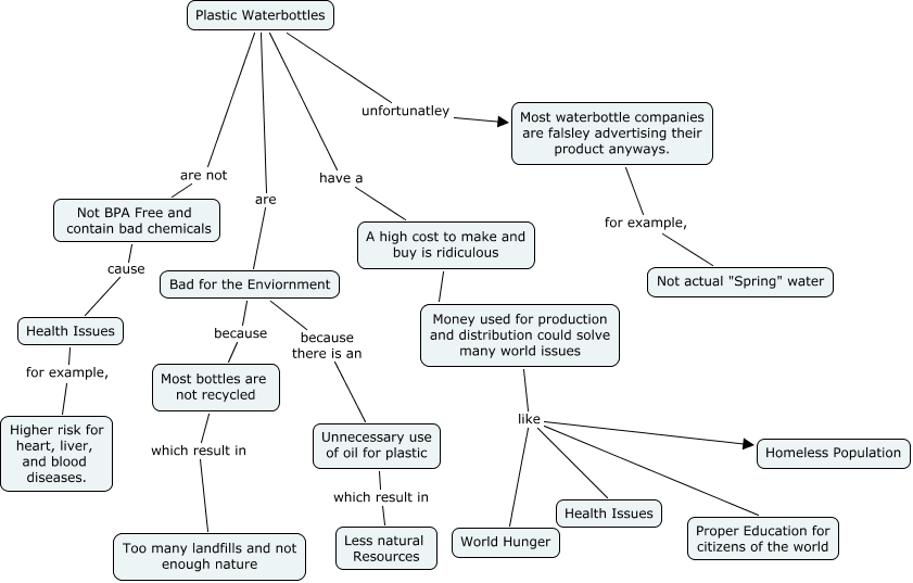 This Concept Map, created with IHMC CmapTools, has information related to: Stella and Katharine's Map 2, Plastic Waterbottles are Bad for the Enviornment, Bad for the Enviornment because there is an Unnecessary use of oil for plastic, Not BPA Free and contain bad chemicals cause Health Issues, Plastic Waterbottles unfortunatley Most waterbottle companies are falsley advertising their product anyways., Money used for production and distribution could solve many world issues like Proper Education for citizens of the world, Bad for the Enviornment because Most bottles are not recycled, Plastic Waterbottles have a A high cost to make and buy is ridiculous, Unnecessary use of oil for plastic which result in Less natural Resources, Money used for production and distribution could solve many world issues like Homeless Population, Most bottles are not recycled which result in Too many landfills and not enough nature, Money used for production and distribution could solve many world issues like Health Issues, Plastic Waterbottles are not Not BPA Free and contain bad chemicals, Health Issues for example, Higher risk for heart, liver, and blood diseases., Money used for production and distribution could solve many world issues like World Hunger, Most waterbottle companies are falsley advertising their product anyways. for example, Not actual "Spring" water, A high cost to make and buy is ridiculous ???? Money used for production and distribution could solve many world issues