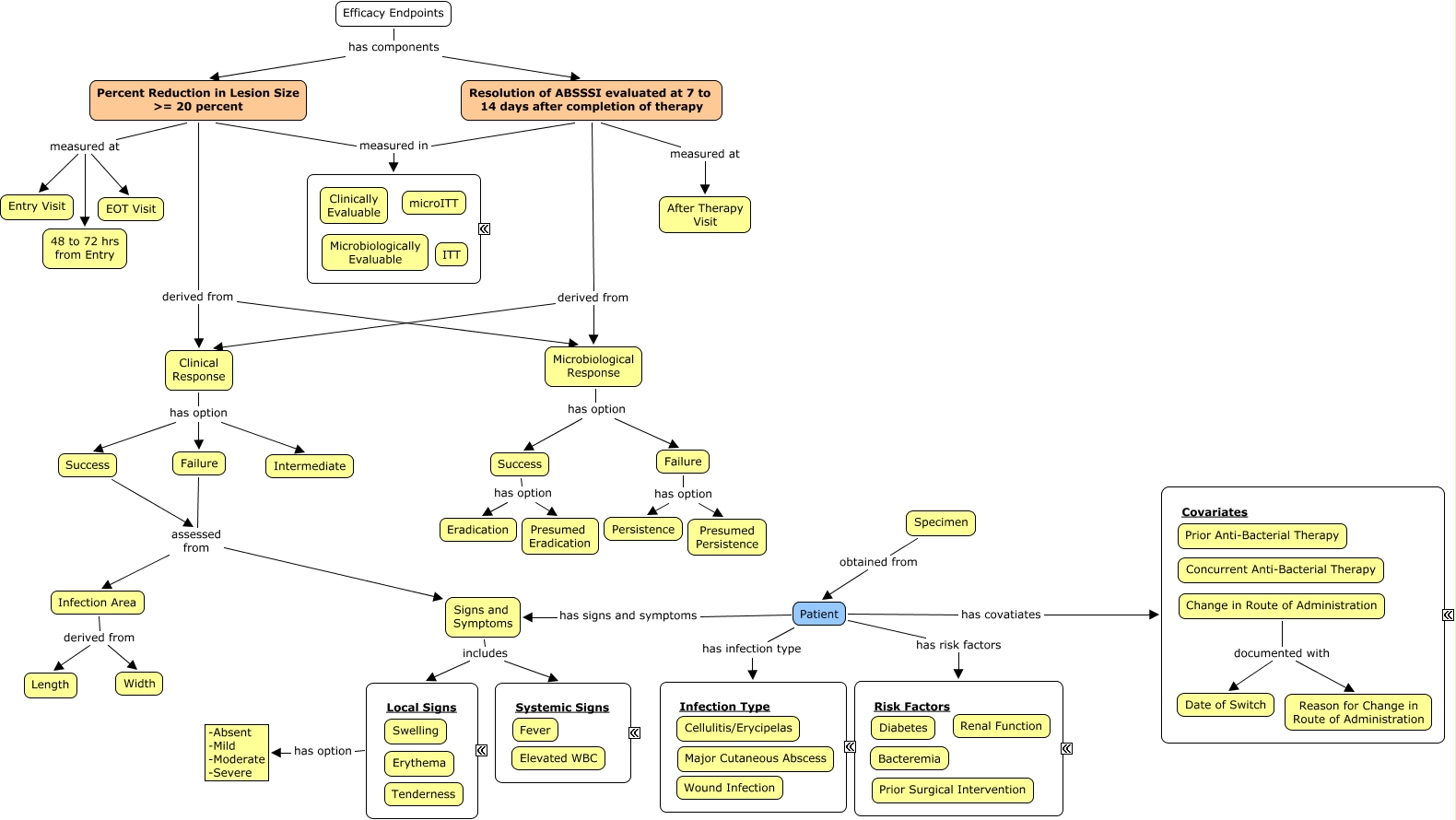 This Concept Map, created with IHMC CmapTools, has information related to: Skin Infection Efficacy Framework - v1, Percent Reduction in Lesion Size >= 20 percent derived from Microbiological Response, Patient has infection type ????, Specimen obtained from Patient, ???? has option -Absent -Mild -Moderate -Severe, Clinical Response has option Failure, Failure has option Persistence, Failure assessed from Infection Area, Change in Route of Administration documented with Date of Switch, Success assessed from Infection Area, Clinical Response has option Intermediate, Percent Reduction in Lesion Size >= 20 percent measured in ????, Success has option Eradication, Percent Reduction in Lesion Size >= 20 percent derived from Clinical Response, Microbiological Response has option Failure, Patient has risk factors ????, Resolution of ABSSSI evaluated at 7 to 14 days after completion of therapy derived from Clinical Response, Efficacy Endpoints has components Percent Reduction in Lesion Size >= 20 percent, Percent Reduction in Lesion Size >= 20 percent measured at EOT Visit, Signs and Symptoms includes ????, Resolution of ABSSSI evaluated at 7 to 14 days after completion of therapy measured at After Therapy Visit