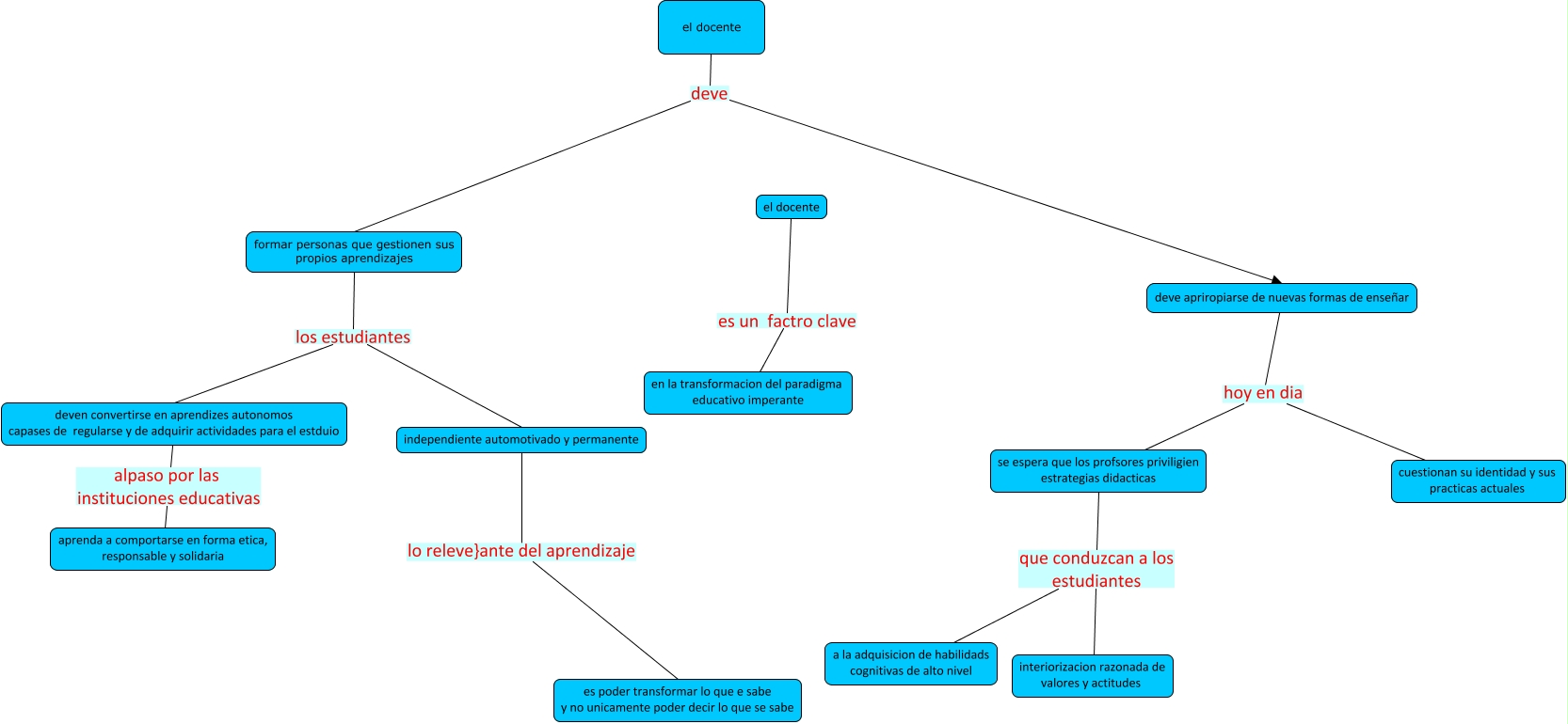 Esse mapa conceitual, produzido no IHMC CmapTools, tem a informação relacionada a: lupis, formar personas que gestionen sus propios aprendizajes los estudiantes deven convertirse en aprendizes autonomos capases de regularse y de adquirir actividades para el estduio, deve apriropiarse de nuevas formas de enseñar hoy en dia se espera que los profsores priviligien estrategias didacticas, se espera que los profsores priviligien estrategias didacticas que conduzcan a los estudiantes interiorizacion razonada de valores y actitudes, formar personas que gestionen sus propios aprendizajes los estudiantes independiente automotivado y permanente, se espera que los profsores priviligien estrategias didacticas que conduzcan a los estudiantes a la adquisicion de habilidads cognitivas de alto nivel, el docente deve deve apriropiarse de nuevas formas de enseñar, el docente es un factro clave en la transformacion del paradigma educativo imperante, deve apriropiarse de nuevas formas de enseñar hoy en dia cuestionan su identidad y sus practicas actuales, el docente deve formar personas que gestionen sus propios aprendizajes, deven convertirse en aprendizes autonomos capases de regularse y de adquirir actividades para el estduio alpaso por las instituciones educativas aprenda a comportarse en forma etica, responsable y solidaria, independiente automotivado y permanente lo releve}ante del aprendizaje es poder transformar lo que e sabe y no unicamente poder decir lo que se sabe