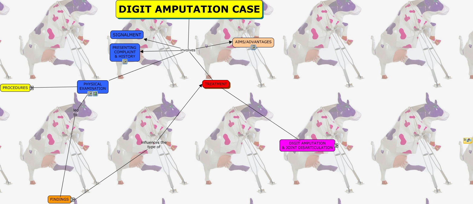 This Concept Map, created with IHMC CmapTools, has information related to: FINAL, PHYSICAL EXAMINATION led to FINDINGS, LAMENSS EXAM Consists of EXAM OF CLAW, PROCEDURES include AMPUTATION THROUGH PHALANX, DIGITAL AMPUTATION invovles PRE-OP, DIGIT AMPUTATION CASE involves AIMS/ADVANTAGES, TENTATIVE & DIFFERENIAL DIAGNOSES confirmed by DIAGNOSTIC & ANCILLARY TEST, LAMENSS EXAM Consists of LOCOMOTION SCORING OF LAMENESS, PRE-OP involves RESTRAINT, POST-OP includes WITHDRAWAL TIMES, PHYSICAL EXAMINATION includes DISTANCE EXAM, DISTANCE EXAM includes 1 Envrionment 2 Demeanor 3 Posture/gait stance 4 Conformation 5 Lumps,bumps, lacteration, lesions 6 Ectorparasites 7 Hair coat and skin 8 Discharges 9 Respiration 10 BCS 11 Breed, PROCEDURES include DISARTICULATION BETWEEN PIP JOINT, PRE-OP involves ASA GRADE, DIGIT AMPUTATION CASE involves PHYSICAL EXAMINATION, DIGITAL AMPUTATION invovles INTRA-OP, INTRA-OP includes PATIENT MONITORING, TREATMENT would be DIGITAL AMPUTATION, POST-OP includes FOLLOW UP, FINDINGS results in a PROBLEM LIST, PROBLEM LIST led to TENTATIVE & DIFFERENIAL DIAGNOSES