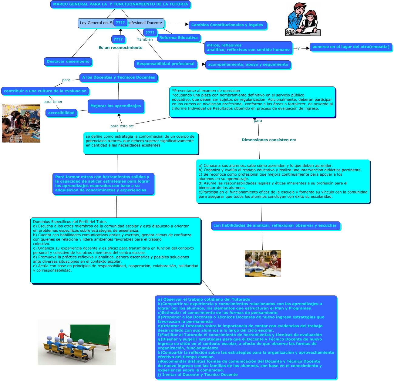 Este Cmap, tiene información relacionada con: ambientes de aprendizaje, mtros, reflexivos analitico, reflexivos con sentido humano y ponerse en el lugar del otro(empatia), Dominios Específicos del Perfil del Tutor. a) Escucha a los otros miembros de la comunidad escolar y está dispuesto a orientar en problemas específicos sobre estrategias de enseñanza. b) Cuenta con habilidades comunicativas orales y escritas, genera climas de confianza con quienes se relaciona y lidera ambientes favorables para el trabajo colectivo. c) Organiza su experiencia docente y es eficaz para transmitirla en función del contexto personal y colectivo de los otros miembros del centro escolar. d) Promueve la práctica reflexiva y analítica, genera escenarios y posibles soluciones ante diversas situaciones en el contexto escolar. e) Actúa con base en principios de responsabilidad, cooperación, colaboración, solidaridad y corresponsabilidad. ???? a) Observar el trabajo cotidiano del Tutorado b)Compartir su experiencia y conocimientos relacionados con los aprendizajes a lograr por los alumnos, los elementos que estructuran el Plan y Programas c)Estimular el conocimiento de las formas de pensamiento d)Proponer a los Docentes o Técnicos Docentes de nuevo ingreso estrategias que favorezcan la permanencia e)Orientar al Tutorado sobre la importancia de contar con evidencias del trabajo desarrollado con sus alumnos a lo largo del ciclo escolar. f)Facilitar al Tutorado el conocimiento de herramientas y técnicas de evaluación g)Diseñar y sugerir estrategias para que el Docente y Técnico Docente de nuevo ingreso se sitúe en el contexto escolar, a efecto de que observe las formas de organización, funcionamiento h)Compartir la reflexión sobre las estrategias para la organización y aprovechamiento efectivo del tiempo escolar. i)Recomendar distintas formas de comunicación del Docente y Técnico Docente de nuevo ingreso con las familias de los alumnos, con base en el conocimiento y experiencia sobre la comunidad. j) Invitar al Docente y Técnico Docente, accesibilidad ???? Mejorar los aprendizajes, *Presentarse al examen de oposicion *ocupando una plaza con nombramiento definitivo en el servicio público educativo, que deben ser sujetos de regularización. Adicionalmente, deberán participar en los cursos de nivelación profesional, conforme a las áreas a fortalecer, de acuerdo al Informe Individual de Resultados obtenido en proceso de evaluación de ingreso. para esto se: Mejorar los aprendizajes, Es un reconocimiento Ley General del Servicio Profesional Docente, para *Presentarse al examen de oposicion *ocupando una plaza con nombramiento definitivo en el servicio público educativo, que deben ser sujetos de regularización. Adicionalmente, deberán participar en los cursos de nivelación profesional, conforme a las áreas a fortalecer, de acuerdo al Informe Individual de Resultados obtenido en proceso de evaluación de ingreso., Reforma Educativa ???? mtros, reflexivos analitico, reflexivos con sentido humano, Responsabilidad profesional ???? acompañamiento, apoyo y seguimiento, contribuir a una cultura de la evaluacion para tener accesibilidad, contribuir a una cultura de la evaluacion para ????, MARCO GENERAL PARA LA Y FUNCIUONAMIENTO DE LA TUTORIA Tambien Responsabilidad profesional, MARCO GENERAL PARA LA Y FUNCIUONAMIENTO DE LA TUTORIA ???? Destacar desempeño, Reforma Educativa ???? Ley General del Servicio Profesional Docente, Ley General del Servicio Profesional Docente ???? Cambios Constitucionales y legales, Es un reconocimiento ???? Dominios Específicos del Perfil del Tutor. a) Escucha a los otros miembros de la comunidad escolar y está dispuesto a orientar en problemas específicos sobre estrategias de enseñanza. b) Cuenta con habilidades comunicativas orales y escritas, genera climas de confianza con quienes se relaciona y lidera ambientes favorables para el trabajo colectivo. c) Organiza su experiencia docente y es eficaz para transmitirla en función del contexto personal y colectivo de los otros miembros del centro escolar. d) Promueve la práctica reflexiva y analítica, genera escenarios y posibles soluciones ante diversas situaciones en el contexto escolar. e) Actúa con base en principios de responsabilidad, cooperación, colaboración, solidaridad y corresponsabilidad.