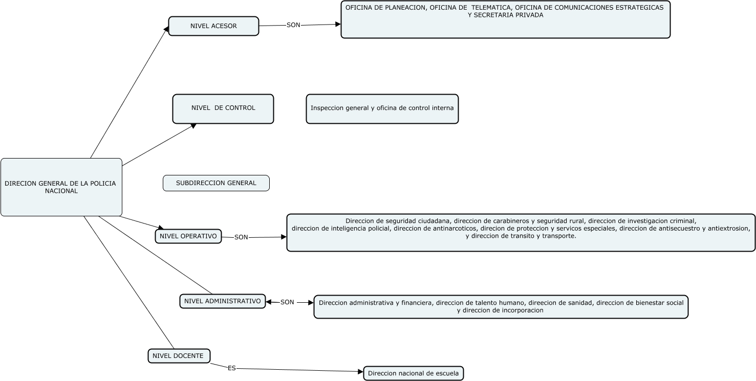 Este Cmap, tiene información relacionada con: Carlitos, DIRECION GENERAL DE LA POLICIA NACIONAL ???? NIVEL DE CONTROL, DIRECION GENERAL DE LA POLICIA NACIONAL ???? NIVEL DOCENTE, NIVEL OPERATIVO SON Direccion de seguridad ciudadana, direccion de carabineros y seguridad rural, direccion de investigacion criminal, direccion de inteligencia policial, direccion de antinarcoticos, direcion de proteccion y servicos especiales, direccion de antisecuestro y antiextrosion, y direccion de transito y transporte., DIRECION GENERAL DE LA POLICIA NACIONAL ???? NIVEL ACESOR, DIRECION GENERAL DE LA POLICIA NACIONAL ???? NIVEL OPERATIVO, NIVEL ADMINISTRATIVO SON Direccion administrativa y financiera, direccion de talento humano, direecion de sanidad, direccion de bienestar social y direccion de incorporacion, NIVEL DOCENTE ES Direccion nacional de escuela, DIRECION GENERAL DE LA POLICIA NACIONAL ???? NIVEL ADMINISTRATIVO, NIVEL ACESOR SON OFICINA DE PLANEACION, OFICINA DE TELEMATICA, OFICINA DE COMUNICACIONES ESTRATEGICAS Y SECRETARIA PRIVADA