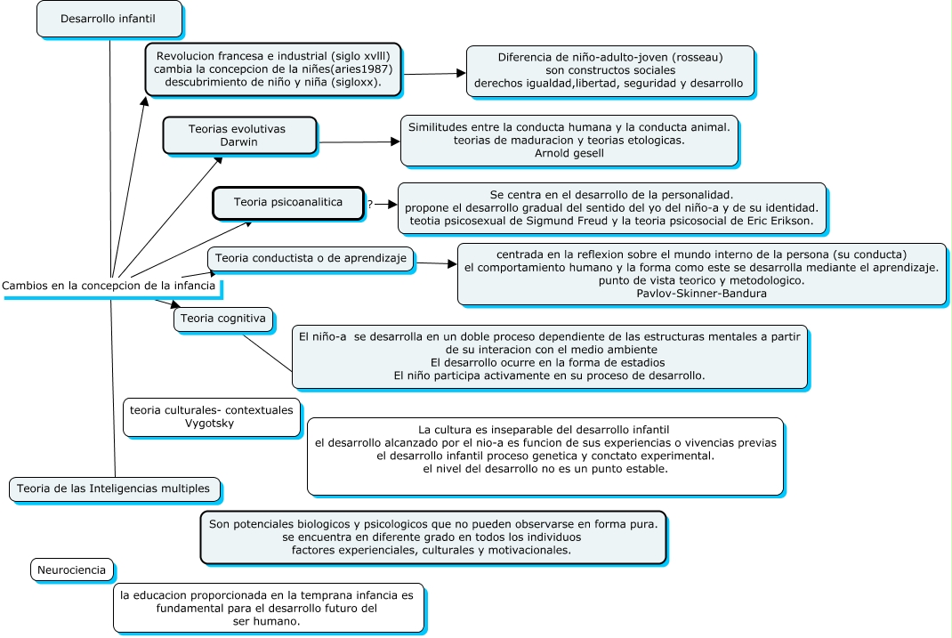Este Cmap, tiene información relacionada con: Denyse, Teoria conductista o de aprendizaje ???? centrada en la reflexion sobre el mundo interno de la persona (su conducta) el comportamiento humano y la forma como este se desarrolla mediante el aprendizaje. punto de vista teorico y metodologico. Pavlov-Skinner-Bandura, Desarrollo infantil Cambios en la concepcion de la infancia Teorias evolutivas Darwin, Desarrollo infantil Cambios en la concepcion de la infancia Teoria cognitiva, Teoria psicoanalitica ???? Se centra en el desarrollo de la personalidad. propone el desarrollo gradual del sentido del yo del niño-a y de su identidad. teotia psicosexual de Sigmund Freud y la teoria psicosocial de Eric Erikson., Desarrollo infantil Cambios en la concepcion de la infancia Teoria conductista o de aprendizaje, Desarrollo infantil Cambios en la concepcion de la infancia Teoria de las Inteligencias multiples, Revolucion francesa e industrial (siglo xvlll) cambia la concepcion de la niñes(aries1987) descubrimiento de niño y niña (sigloxx). ???? Diferencia de niño-adulto-joven (rosseau) son constructos sociales derechos igualdad,libertad, seguridad y desarrollo, Desarrollo infantil Cambios en la concepcion de la infancia Teoria psicoanalitica, Teorias evolutivas Darwin ???? Similitudes entre la conducta humana y la conducta animal. teorias de maduracion y teorias etologicas. Arnold gesell, Desarrollo infantil Cambios en la concepcion de la infancia Revolucion francesa e industrial (siglo xvlll) cambia la concepcion de la niñes(aries1987) descubrimiento de niño y niña (sigloxx)., Teoria cognitiva ???? El niño-a se desarrolla en un doble proceso dependiente de las estructuras mentales a partir de su interacion con el medio ambiente El desarrollo ocurre en la forma de estadios El niño participa activamente en su proceso de desarrollo.