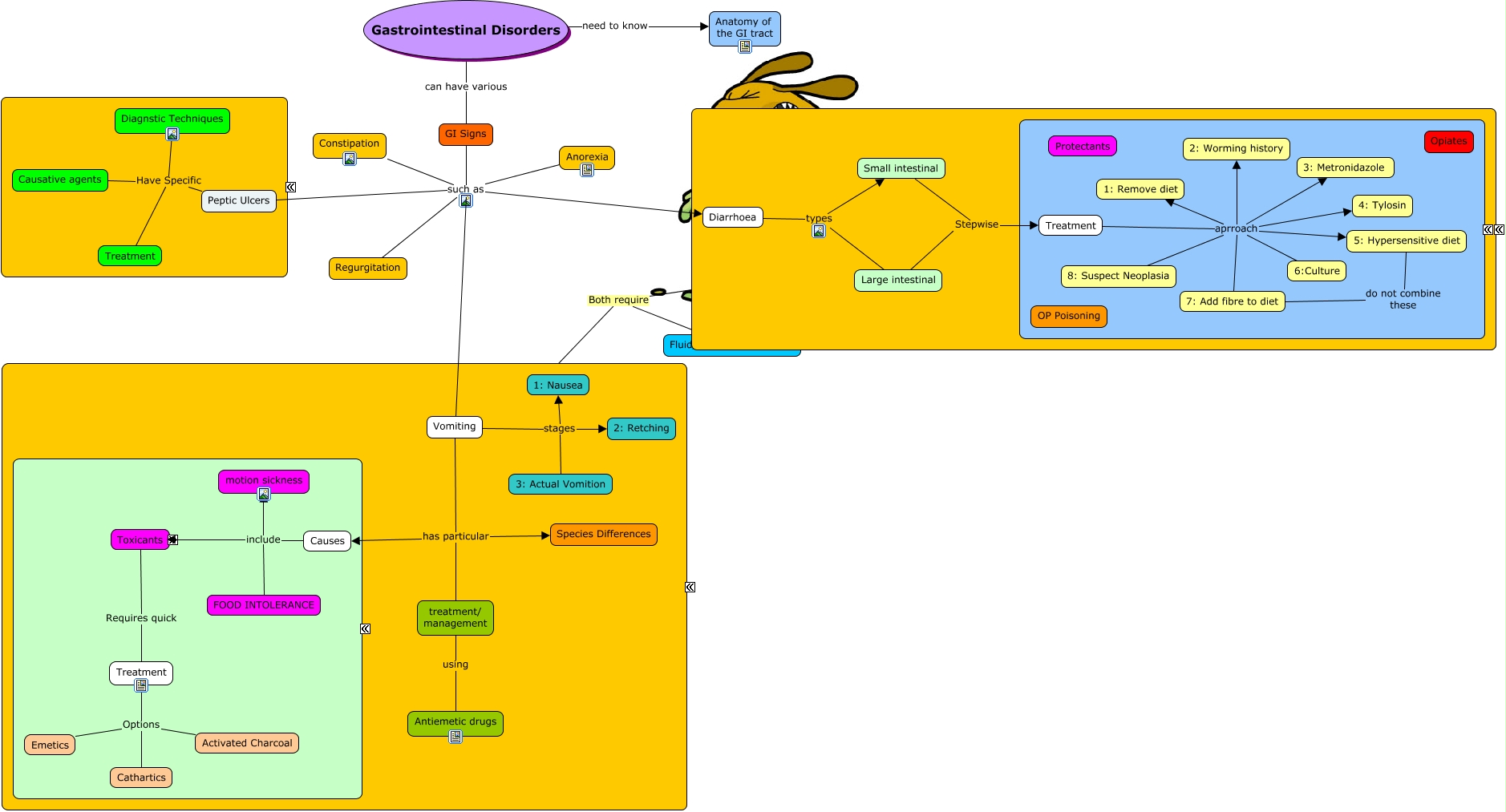 This Concept Map, created with IHMC CmapTools, has information related to: clin pharm 5, Treatment Options Activated Charcoal, Peptic Ulcers Have Specific Diagnstic Techniques, Causes include toxicants, Vomiting has particular Species Differences, Peptic Ulcers Have Specific Treatment, Gastrointestinal Disorders need to know Anatomy of the GI tract, Treatment aprroach 5: Hypersensitive diet, GI Signs such as Constipation, Gastrointestinal Disorders can have various GI Signs, Diarrhoea Both require Fluid/ Electrolyte Therapy, Treatment aprroach 7: Add fibre to diet, Toxicants Requires quick Treatment, Vomiting Both require Fluid/ Electrolyte Therapy, Small intestinal Stepwise Treatment, Vomiting stages 2: Retching, Vomiting has particular treatment/ management, Diarrhoea types Small intestinal, GI Signs such as Vomiting, Treatment Options Emetics, GI Signs such as Peptic Ulcers
