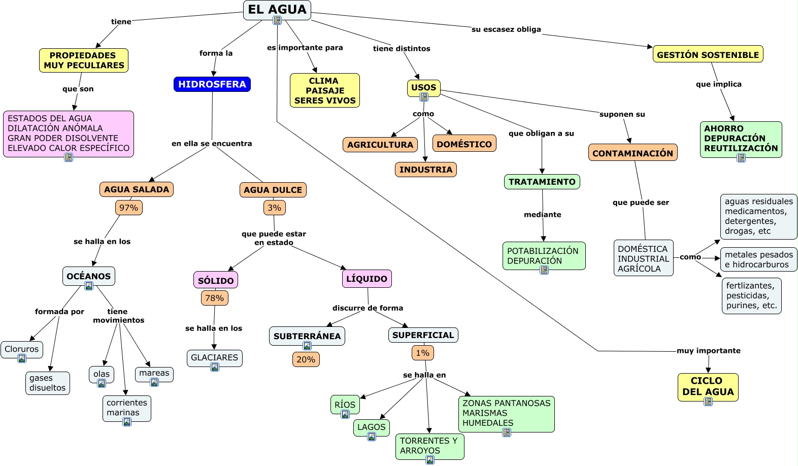 Este Cmap, tiene información relacionada con: La hidrosfera, DOMÉSTICA INDUSTRIAL AGRÍCOLA como aguas residuales medicamentos, detergentes, drogas, etc, EL AGUA forma la HIDROSFERA, EL AGUA tiene PROPIEDADES MUY PECULIARES, SÓLIDO se halla en los GLACIARES, SUPERFICIAL se halla en TORRENTES Y ARROYOS, OCÉANOS formada por Cloruros, USOS como INDUSTRIA, EL AGUA es importante para CLIMA PAISAJE SERES VIVOS, OCÉANOS formada por gases disueltos, LÍQUIDO discurre de forma SUBTERRÁNEA, USOS suponen su CONTAMINACIÓN, USOS que obligan a su TRATAMIENTO, OCÉANOS tiene movimientos mareas, LÍQUIDO discurre de forma SUPERFICIAL, AGUA SALADA se halla en los OCÉANOS, EL AGUA tiene distintos USOS, OCÉANOS tiene movimientos olas, HIDROSFERA en ella se encuentra AGUA SALADA, GESTIÓN SOSTENIBLE que implica AHORRO DEPURACIÓN REUTILIZACIÓN, OCÉANOS tiene movimientos corrientes marinas