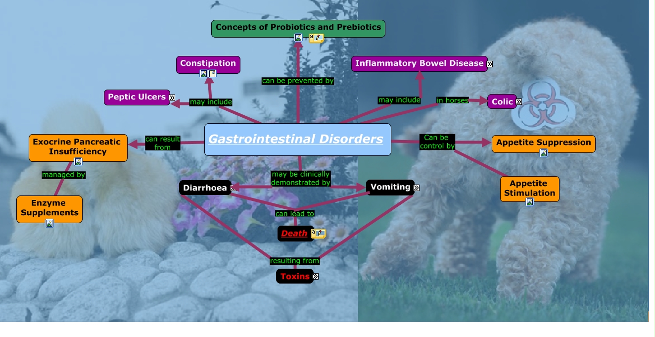 This Concept Map, created with IHMC CmapTools, has information related to: Management of Gastrointestinal Disorders, Treatment divided into Diet, Treatment divided into Medication, Antiemetics specifically Cerenia, Tests leads to Treatment, Gastrointestinal Disorders may include Constipation, Causes specific to Canine Parvovirus, Gastrointestinal Disorders Can be control by Appetite Stimulation, Vomiting can lead to Death, Exocrine Pancreatic Insufficiency managed by Enzyme Supplements, Gastrointestinal Disorders may include Inflammatory Bowel Disease, Inflammatory Bowel Disease resolved by Treatment, Medical Treatment of Colic done by Analgesic Therapy, Diarrhoea due To Causes, Peptic Ulcers occur by Pathogenesis, Medical Treatment of Colic done by Antispasmodic Medication, Diarrhoea resulting from Toxins, Gastrointestinal Disorders can result from Exocrine Pancreatic Insufficiency, Vomiting Resovled by Treatment, Peptic Ulcers resolved by Treatment, Gastrointestinal Disorders Can be control by Appetite Suppression