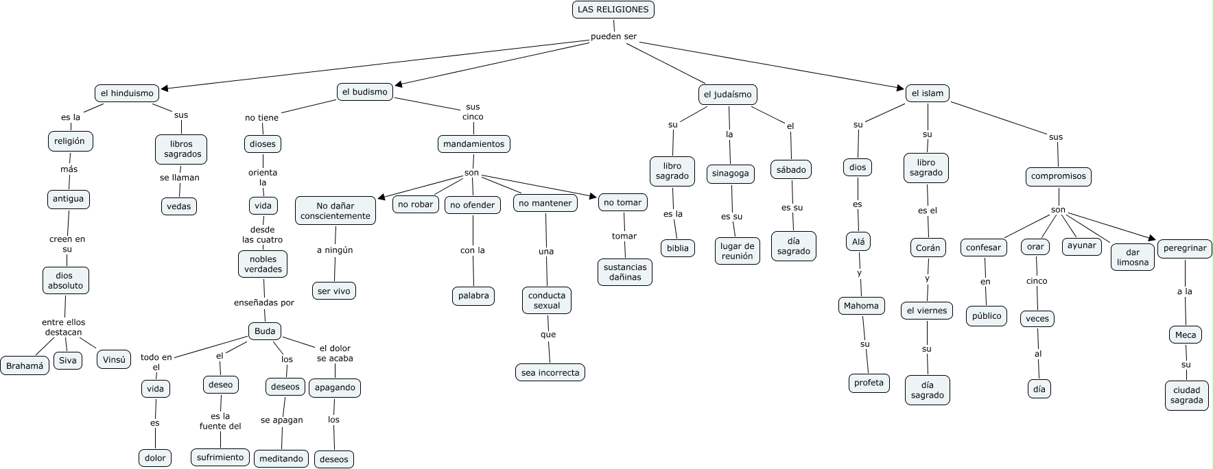 Este Cmap, tiene información relacionada con: Las religiones(Paco,Diego,Hlenia,Adriana), el islam su libro sagrado, compromisos son confesar, conducta sexual que sea incorrecta, confesar en público, veces al día, dios absoluto entre ellos destacan Brahamá, el budismo sus cinco mandamientos, nobles verdades enseñadas por Buda, el judaísmo la sinagoga, LAS RELIGIONES pueden ser el islam, no tomar tomar sustancias dañinas, dioses orienta la vida, mandamientos son no robar, mandamientos son no ofender, mandamientos son no mantener, mandamientos son No dañar conscientemente, compromisos son orar, deseo es la fuente del sufrimiento, el budismo no tiene dioses, Alá y Mahoma