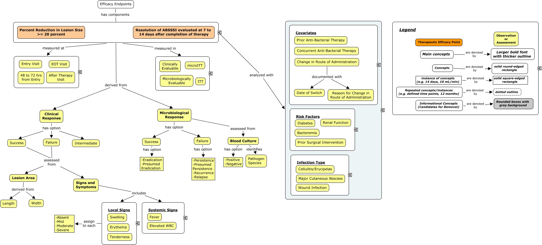This Concept Map, created with IHMC CmapTools, has information related to: Skin Infection Efficacy Framework - v2, Clinical Response has option Intermediate, Failure assessed from Signs and Symptoms, Repeated concepts/instances (e.g. defined time points, 12 months) are denoted by dotted outline, Signs and Symptoms includes ????, Failure has option -Persistence -Presumed Persistence -Recurrence -Relapse, instance of concepts (e.g. 14 days, 10 mL/min) are denoted by solid square-edged rectangle, Informational Concepts (Candidates for Removal) are denoted by Rounded boxes with grey background, Change in Route of Administration documented with Date of Switch, Concepts are denoted by solid round-edged rectangle, ???? analyzed with ????, Lesion Area derived from Length, Clinical Response has option Success, Success assessed from Lesion Area, ???? derived from Clinical Response, Efficacy Endpoints has components ????, Microbiological Response assessed from Blood Culture, Main concepts are denoted by Larger bold font with thicker outline, Signs and Symptoms includes ????, ???? measured in ????, Microbiological Response has option Success