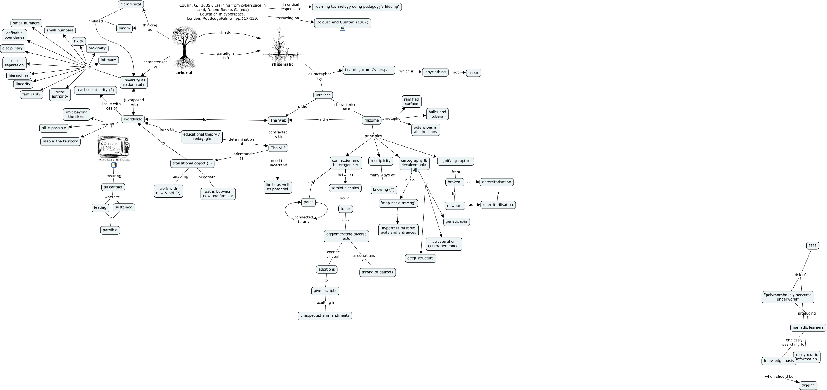 This Concept Map, created with IHMC CmapTools, has information related to: Cousin paper, knowledge oasis when should be digging, rhizome principles signifying rupture, semiotic chains like a tuber, The Web contrasted with The VLE, ???? risk of idiosyncratic information, rhizomatic as metaphor for Learning from Cyberspace, sustained is possible, newborn as reterritorilisation, rhizome metaphor extensions in all directions, The VLE understand as transitional object (?), ???? risk of "polymorphously perverse underworld", broken as deterritorisation, cartography & decalcomania no genetic axis, rhizome principles multiplicity, Cousin, G. (2005). Learning from cyberspace in Land, R. and Bayne, S. (eds) Education in cyberspace. London, RoutledgeFalmer. pp.117-129. in critical response to 'learning technology doing pedagogy's bidding', Cousin, G. (2005). Learning from cyberspace in Land, R. and Bayne, S. (eds) Education in cyberspace. London, RoutledgeFalmer. pp.117-129. contrasts arborial, connection and heterogeneity any point, rhizomatic as metaphor for internet, given scripts resulting in unexpected ammendments, The VLE need to undertand limits as well as potential