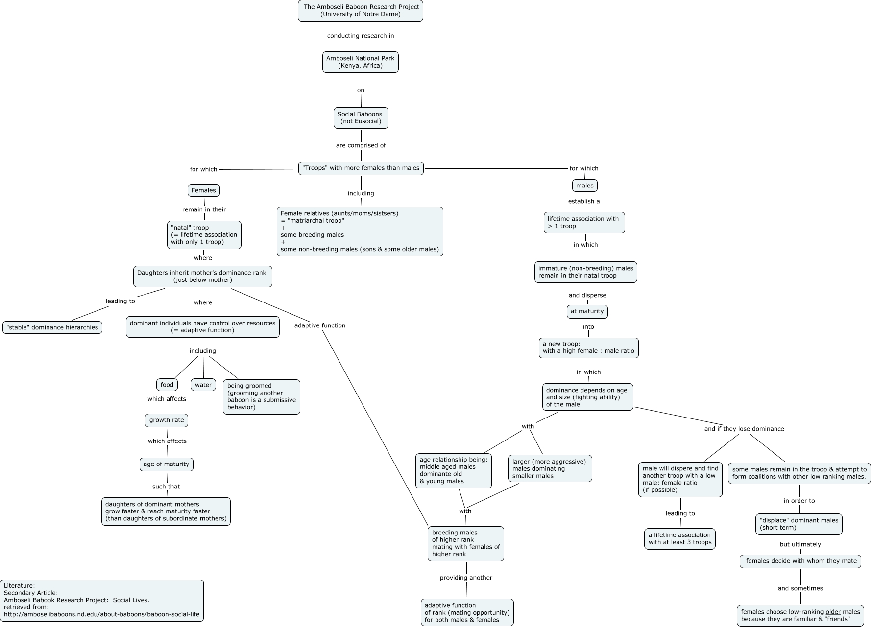 This Concept Map, created with IHMC CmapTools, has information related to: Amboseli Baboons, males establish a lifetime association with > 1 troop, dominance depends on age and size (fighting ability) of the male with age relationship being: middle aged males dominante old & young males, Daughters inherit mother's dominance rank (just below mother) leading to "stable" dominance hierarchies, "displace" dominant males (short term) but ultimately females decide with whom they mate, Daughters inherit mother's dominance rank (just below mother) where dominant individuals have control over resources (= adaptive function), Daughters inherit mother's dominance rank (just below mother) adaptive function breeding males of higher rank mating with females of higher rank, a new troop: with a high female : male ratio in which dominance depends on age and size (fighting ability) of the male, Amboseli National Park (Kenya, Africa) on Social Baboons (not Eusocial), at maturity into a new troop: with a high female : male ratio, food which affects growth rate, Females remain in their "natal" troop (= lifetime association with only 1 troop), dominance depends on age and size (fighting ability) of the male and if they lose dominance male will dispere and find another troop with a low male: female ratio (if possible), larger (more aggressive) males dominating smaller males with breeding males of higher rank mating with females of higher rank, lifetime association with > 1 troop in which immature (non-breeding) males remain in their natal troop, "Troops" with more females than males for which Females, Social Baboons (not Eusocial) are comprised of "Troops" with more females than males, breeding males of higher rank mating with females of higher rank providing another adaptive function of rank (mating opportunity) for both males & females, age relationship being: middle aged males dominante old & young males with breeding males of higher rank mating with females of higher rank, "natal" troop (= lifetime association with only 1 troop) where Daughters inherit mother's dominance rank (just below mother), The Amboseli Baboon Research Project (University of Notre Dame) conducting research in Amboseli National Park (Kenya, Africa)