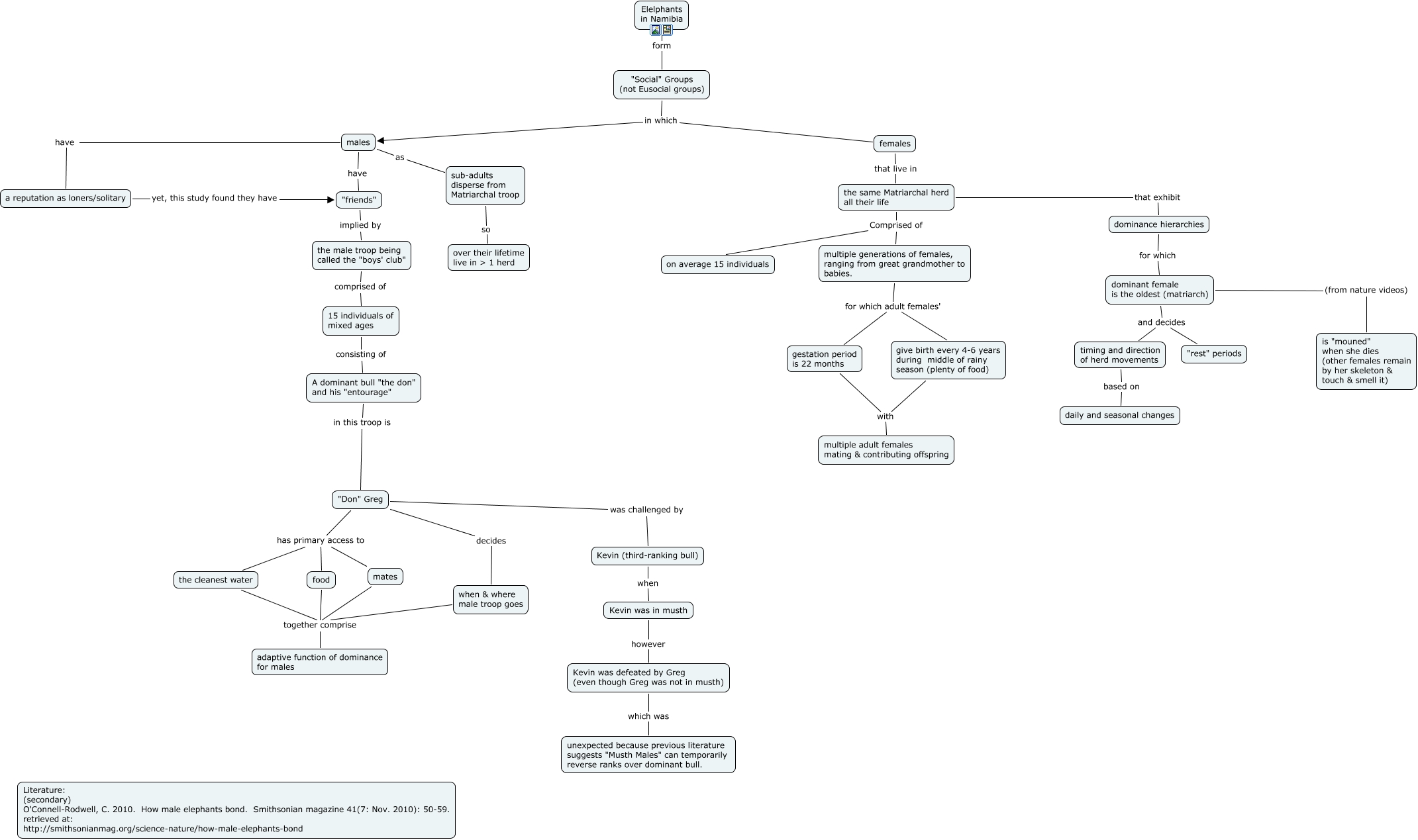 This Concept Map, created with IHMC CmapTools, has information related to: Elephants of Namibia, A dominant bull "the don" and his "entourage" in this troop is "Don" Greg, multiple generations of females, ranging from great grandmother to babies. for which adult females' give birth every 4-6 years during middle of rainy season (plenty of food), give birth every 4-6 years during middle of rainy season (plenty of food) with multiple adult females mating & contributing offspring, "friends" implied by the male troop being called the "boys' club", "Don" Greg decides when & where male troop goes, Kevin was in musth however Kevin was defeated by Greg (even though Greg was not in musth), dominance hierarchies for which dominant female is the oldest (matriarch), "Social" Groups (not Eusocial groups) in which females, males have "friends", Kevin was defeated by Greg (even though Greg was not in musth) which was unexpected because previous literature suggests "Musth Males" can temporarily reverse ranks over dominant bull., "Social" Groups (not Eusocial groups) in which males, multiple generations of females, ranging from great grandmother to babies. for which adult females' gestation period is 22 months, gestation period is 22 months with multiple adult females mating & contributing offspring, dominant female is the oldest (matriarch) and decides timing and direction of herd movements, the same Matriarchal herd all their life Comprised of multiple generations of females, ranging from great grandmother to babies., when & where male troop goes together comprise adaptive function of dominance for males, dominant female is the oldest (matriarch) (from nature videos) is "mouned" when she dies (other females remain by her skeleton & touch & smell it), Elelphants in Namibia form "Social" Groups (not Eusocial groups), the male troop being called the "boys' club" comprised of 15 individuals of mixed ages, males as sub-adults disperse from Matriarchal troop