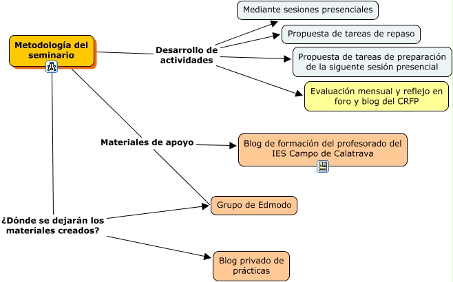 Este Cmap, tiene información relacionada con: metodología, Metodología del seminario ¿Dónde se dejarán los materiales creados? Grupo de Edmodo, Metodología del seminario Materiales de apoyo Blog de formación del profesorado del IES Campo de Calatrava, Metodología del seminario Desarrollo de actividades Propuesta de tareas de repaso, Metodología del seminario ¿Dónde se dejarán los materiales creados? Blog privado de prácticas, Metodología del seminario Desarrollo de actividades Propuesta de tareas de preparación de la siguente sesión presencial, Metodología del seminario Materiales de apoyo Grupo de Edmodo, Metodología del seminario Desarrollo de actividades Evaluación mensual y reflejo en foro y blog del CRFP, Metodología del seminario Desarrollo de actividades Mediante sesiones presenciales