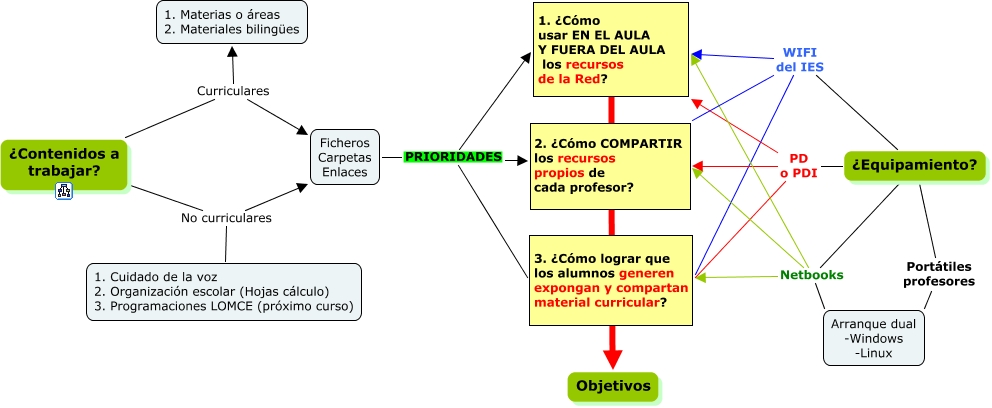 Este Cmap, tiene información relacionada con: contenidos y equipamiento, ¿Equipamiento? WIFI del IES 3. ¿Cómo lograr que los alumnos generen expongan y compartan material curricular?, Ficheros Carpetas Enlaces PRIORIDADES 3. ¿Cómo lograr que los alumnos generen expongan y compartan material curricular?, Ficheros Carpetas Enlaces PRIORIDADES 1. ¿Cómo usar EN EL AULA Y FUERA DEL AULA los recursos de la Red?, 1. ¿Cómo usar EN EL AULA Y FUERA DEL AULA los recursos de la Red? ???? Objetivos, ¿Equipamiento? Netbooks 3. ¿Cómo lograr que los alumnos generen expongan y compartan material curricular?, ¿Equipamiento? WIFI del IES 2. ¿Cómo COMPARTIR los recursos propios de cada profesor?, ¿Equipamiento? WIFI del IES 1. ¿Cómo usar EN EL AULA Y FUERA DEL AULA los recursos de la Red?, ¿Contenidos a trabajar? No curriculares 1. Cuidado de la voz 2. Organización escolar (Hojas cálculo) 3. Programaciones LOMCE (próximo curso), ¿Contenidos a trabajar? Curriculares Ficheros Carpetas Enlaces, ¿Equipamiento? Portátiles profesores Arranque dual -Windows -Linux, ¿Equipamiento? Netbooks 1. ¿Cómo usar EN EL AULA Y FUERA DEL AULA los recursos de la Red?, ¿Equipamiento? Netbooks Arranque dual -Windows -Linux, ¿Contenidos a trabajar? No curriculares Ficheros Carpetas Enlaces, ¿Equipamiento? Netbooks 2. ¿Cómo COMPARTIR los recursos propios de cada profesor?, ¿Contenidos a trabajar? Curriculares 1. Materias o áreas 2. Materiales bilingües, ¿Equipamiento? PD o PDI 1. ¿Cómo usar EN EL AULA Y FUERA DEL AULA los recursos de la Red?, Ficheros Carpetas Enlaces PRIORIDADES 2. ¿Cómo COMPARTIR los recursos propios de cada profesor?, ¿Equipamiento? PD o PDI 2. ¿Cómo COMPARTIR los recursos propios de cada profesor?, ¿Equipamiento? PD o PDI 3. ¿Cómo lograr que los alumnos generen expongan y compartan material curricular?