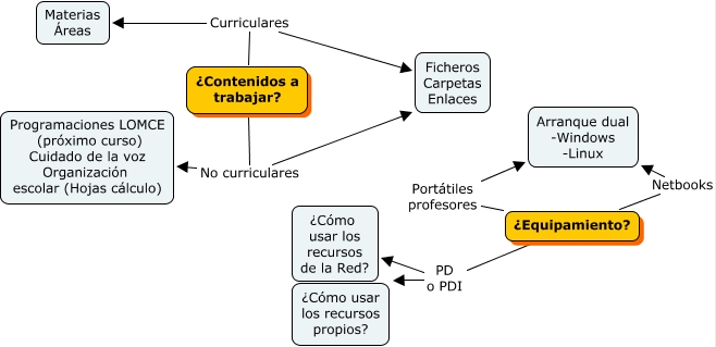 Este Cmap, tiene información relacionada con: contenidos, ¿Equipamiento? Portátiles profesores Arranque dual -Windows -Linux, ¿Equipamiento? Netbooks Arranque dual -Windows -Linux, ¿Contenidos a trabajar? Curriculares Materias Áreas, ¿Contenidos a trabajar? No curriculares Programaciones LOMCE (próximo curso) Cuidado de la voz Organización escolar (Hojas cálculo), ¿Equipamiento? PD o PDI ¿Cómo usar los recursos propios?, ¿Equipamiento? PD o PDI ¿Cómo usar los recursos de la Red?, ¿Contenidos a trabajar? No curriculares Ficheros Carpetas Enlaces, ¿Contenidos a trabajar? Curriculares Ficheros Carpetas Enlaces