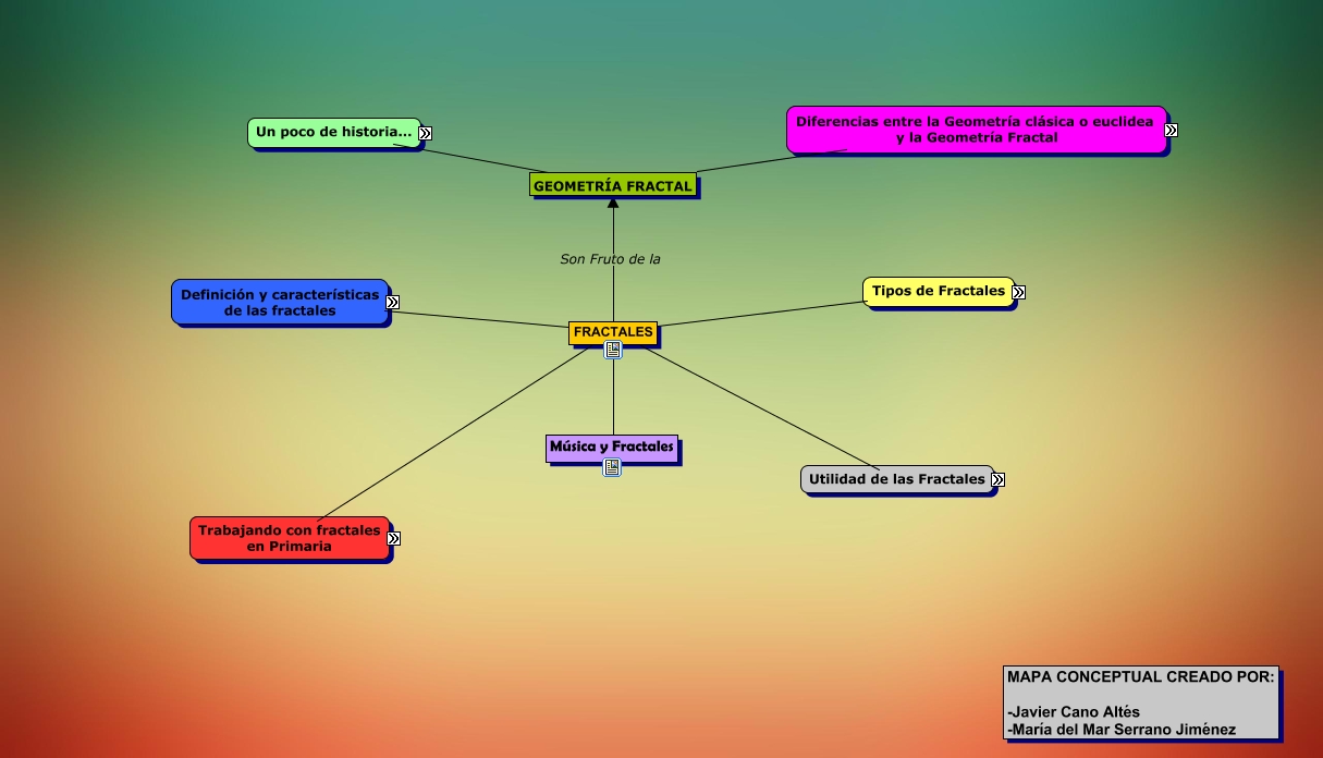 Este Cmap, tiene información relacionada con: FRACTALES, FRACTALES ¿Cómo podemos trabajar con fractales en el aula de Primaria? Actividades con Fractales en Primaria, Actividades con Fractales en Primaria Segundo Ciclo Segundo Ciclo, GEOMETRÍA FRACTAL Principales diferencias -La geometría euclidea tiene más de 2000 años -Dimensión Entera -Estudia objetos ideados por el ser humano -Descrita por fórmulas, Música y Fractales FRACTALES, Un fractal es un ente geométrico que en su desarrollo espacial va reproduciéndose a si mismo cada vez a una escala menor ¿Cuáles son sus características? a) Una característica esencial de los fractales es que si observamos una parte cualquiera del mismo, ésta reproduce a escala menor la figura total del fractal (autosemejanza) b)Su dimensión no es entera c)Se reproduce en infinitas iteraciones, FRACTALES ¿Cómo se clasifican? Fractales lineales, FRACTALES ¿Qué son? Un fractal es un ente geométrico que en su desarrollo espacial va reproduciéndose a si mismo cada vez a una escala menor, FRACTALES ¿Para qué sirven? APLICACIONES -Describir fenómenos del mundo real de forma más fiel que los tradicionales modelos geométricos. -Mandelbrot empleó la geometría fractal para estudiar fenómenos físicos como las Turbulencias. -En la generación de imágenes digitales o en la compresión y análisis de imágenes reales la geometría fractal también ha supuesto un gran avance (ecografía 3D, efectos especiales, videojuegos…etc), FRACTALES Son Fruto de la GEOMETRÍA FRACTAL, GEOMETRÍA FRACTAL Principales diferencias -La geometría fractal aparecío a finales del siglo XX -Dimensión fractal -Apropiada para el estudio de objetos naturales -Fruto de un algorítmo recursivo (repetitivo o iterado), FRACTALES ¿Cómo se clasifican? Fractales NO lineales, GEOMETRÍA FRACTAL ¿Cúal es su origen? HACED CLICK AQUÍ PARA CONOCER LA HISTORIA DE LOS FRACTALES, Actividades con Fractales en Primaria Tercer Ciclo Tercer Ciclo, Actividades con Fractales en Primaria Primer Ciclo Primer Ciclo