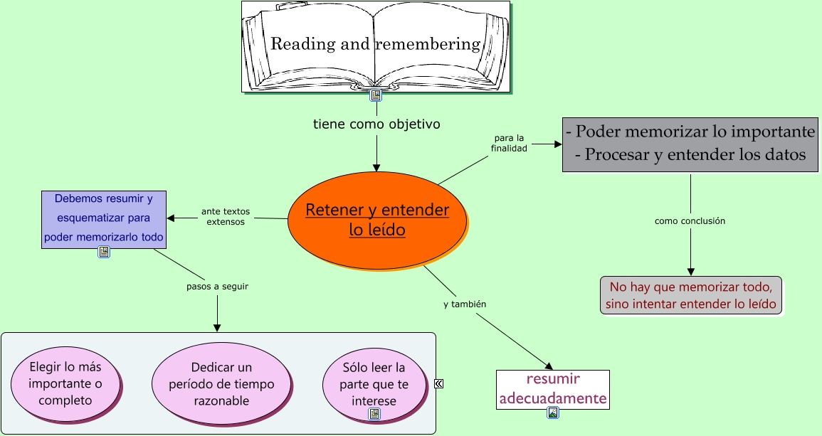 Este Cmap, tiene información relacionada con: Reading and Remembering, Debemos resumir y esquematizar para poder memorizarlo todo pasos a seguir Pasos a seguir para resumir un texto, Reading and remembering tiene como objetivo Retener y entender lo leído, Retener y entender lo leído y también resumir adecuadamente, - Poder memorizar lo importante - Procesar y entender los datos como conclusión No hay que memorizar todo, sino intentar entender lo leído, Retener y entender lo leído ante textos extensos Debemos resumir y esquematizar para poder memorizarlo todo, Retener y entender lo leído para la finalidad - Poder memorizar lo importante - Procesar y entender los datos