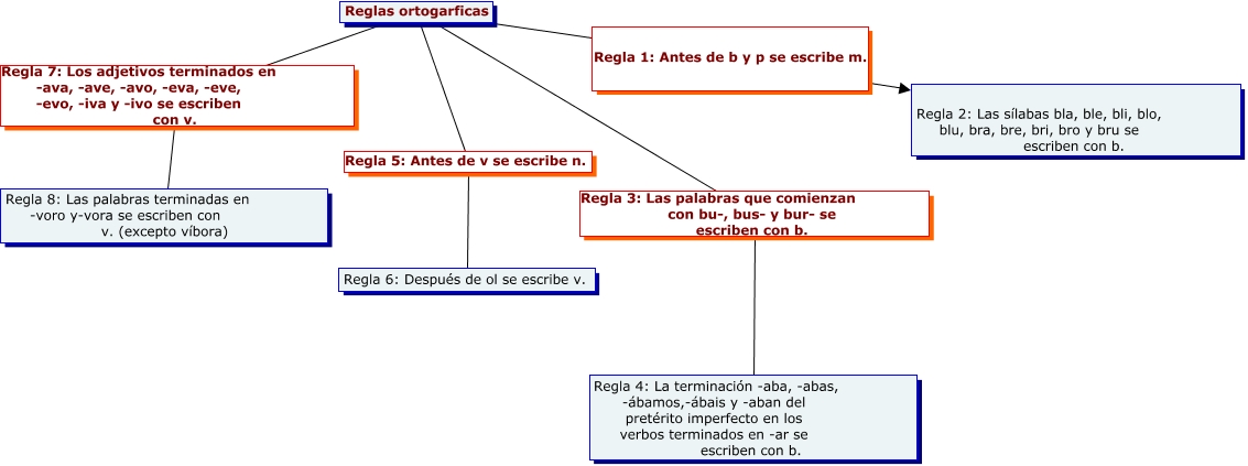 Este Cmap, tiene información relacionada con: Sin Título 1, Reglas ortogarficas Regla 1: Antes de b y p se escribe m. Regla 2: Las sílabas bla, ble, bli, blo, blu, bra, bre, bri, bro y bru se escriben con b., Reglas ortogarficas Regla 7: Los adjetivos terminados en -ava, -ave, -avo, -eva, -eve, -evo, -iva y -ivo se escriben con v. Regla 8: Las palabras terminadas en -voro y-vora se escriben con v. (excepto víbora), Reglas ortogarficas Regla 5: Antes de v se escribe n. Regla 6: Después de ol se escribe v., Reglas ortogarficas Regla 3: Las palabras que comienzan con bu-, bus- y bur- se escriben con b. Regla 4: La terminación -aba, -abas, -ábamos,-ábais y -aban del pretérito imperfecto en los verbos terminados en -ar se escriben con b.