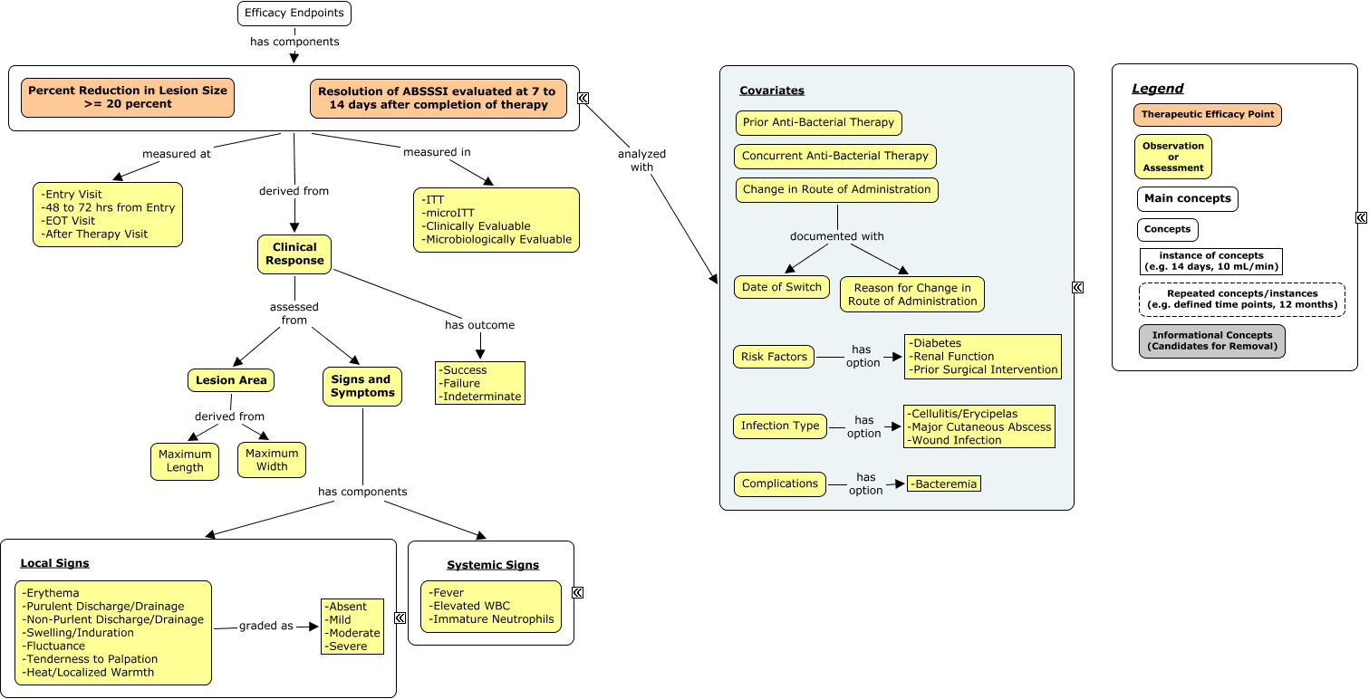 This Concept Map, created with IHMC CmapTools, has information related to: Skin Infection Efficacy Framework - v4, ???? measured in -ITT -microITT -Clinically Evaluable -Microbiologically Evaluable, ???? derived from Clinical Response, -Erythema -Purulent Discharge/Drainage -Non-Purlent Discharge/Drainage -Swelling/Induration -Fluctuance -Tenderness to Palpation -Heat/Localized Warmth graded as -Absent -Mild -Moderate -Severe, Clinical Response has outcome -Success -Failure -Indeterminate, Lesion Area derived from Maximum Width, ???? measured at -Entry Visit -48 to 72 hrs from Entry -EOT Visit -After Therapy Visit, Lesion Area derived from Maximum Length, Clinical Response assessed from Signs and Symptoms, Efficacy Endpoints has components ????, Change in Route of Administration documented with Date of Switch, Clinical Response assessed from Lesion Area, Signs and Symptoms has components ????, Signs and Symptoms has components ????, Complications has option -Bacteremia, Infection Type has option -Cellulitis/Erycipelas -Major Cutaneous Abscess -Wound Infection, Risk Factors has option -Diabetes -Renal Function -Prior Surgical Intervention, Change in Route of Administration documented with Reason for Change in Route of Administration, ???? analyzed with ????