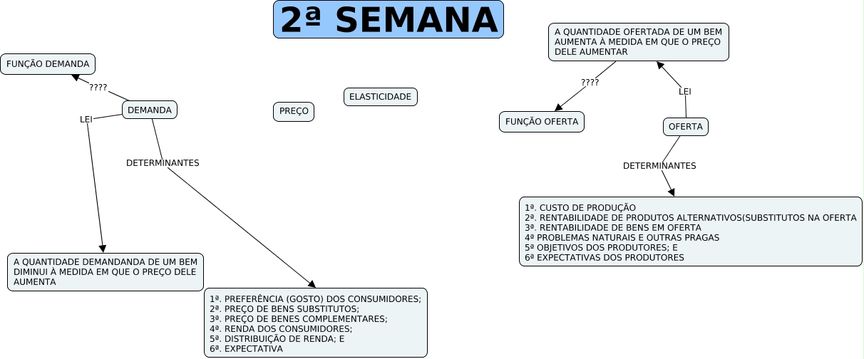 Esse mapa conceitual, produzido no IHMC CmapTools, tem a informação relacionada a: 2ª semana - 24 A 31.08.2014, DEMANDA LEI A QUANTIDADE DEMANDANDA DE UM BEM DIMINUI À MEDIDA EM QUE O PREÇO DELE AUMENTA, OFERTA DETERMINANTES 1ª. CUSTO DE PRODUÇÃO 2ª. RENTABILIDADE DE PRODUTOS ALTERNATIVOS(SUBSTITUTOS NA OFERTA 3ª. RENTABILIDADE DE BENS EM OFERTA 4ª PROBLEMAS NATURAIS E OUTRAS PRAGAS 5ª OBJETIVOS DOS PRODUTORES; E 6ª EXPECTATIVAS DOS PRODUTORES, OFERTA LEI A QUANTIDADE OFERTADA DE UM BEM AUMENTA À MEDIDA EM QUE O PREÇO DELE AUMENTAR, DEMANDA ???? FUNÇÃO DEMANDA, DEMANDA DETERMINANTES 1ª. PREFERÊNCIA (GOSTO) DOS CONSUMIDORES; 2ª. PREÇO DE BENS SUBSTITUTOS; 3ª. PREÇO DE BENES COMPLEMENTARES; 4ª. RENDA DOS CONSUMIDORES; 5ª. DISTRIBUIÇÃO DE RENDA; E 6ª. EXPECTATIVA, A QUANTIDADE OFERTADA DE UM BEM AUMENTA À MEDIDA EM QUE O PREÇO DELE AUMENTAR ???? FUNÇÃO OFERTA
