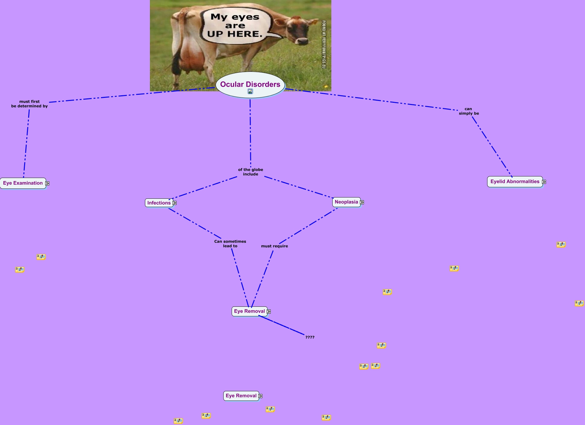 This Concept Map, created with IHMC CmapTools, has information related to: map 1 (couldnt save), Eye Removal methods include Enucleation, Squamous Cell Carcinoma can be confused with Dermoid Cysts, Post-Operative Care depends on Complications, Inherited includes Ectropion, Nerve Block are Peterson, Nerve Block are Ring Block, Eye Removal methods include Enucleation, Eye Removal must require Neoplasia, Infections Can sometimes lead to Eye Removal, Nerve Block are Retrobulbar, Restraint invloves both Chemical, Bovine Iritis has Clincal signs, Eye Removal methods include Exenteration, Infection such as Infectious Bovine Keratoconjuctivitis, Bovine Iritis has Economical Impacts, Eye Removal ???? Indications, Ocular Disorders can simply be Eyelid abnormalities, Nerve Block are Peterson, Entropion Repair Includes Hot Celsus, Nerve Block are Retrobulbar