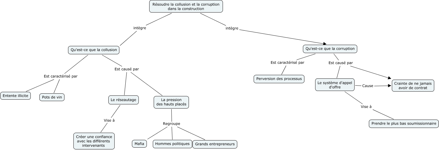 Cette carte de concepts créée avec IHMC CmapTools traite de: Laurent Beaudry, Le système d'appel d'offre Vise à Prendre le plus bas soumissionnaire, Qu'est-ce que la corruption Est caractérisé par Perversion des processus, Résoudre la collusion et la corruption dans la construction intègre Qu'est-ce que la collusion, Qu'est-ce que la collusion Est caractérisé par Pots de vin, Qu'est-ce que la collusion Est caractérisé par Entente illicite, Le réseautage Vise à Créer une confiance avec les différents intervenants, La pression des hauts placés Regroupe Mafia, Qu'est-ce que la collusion Est causé par Le réseautage, La pression des hauts placés Regroupe Grands entrepreneurs, Qu'est-ce que la collusion Est causé par La pression des hauts placés, La pression des hauts placés Regroupe Hommes politiques, Qu'est-ce que la corruption Est causé par Le système d'appel d'offre, Résoudre la collusion et la corruption dans la construction intègre Qu'est-ce que la corruption, Le système d'appel d'offre Cause Crainte de ne jamais avoir de contrat, Qu'est-ce que la corruption Est causé par Crainte de ne jamais avoir de contrat