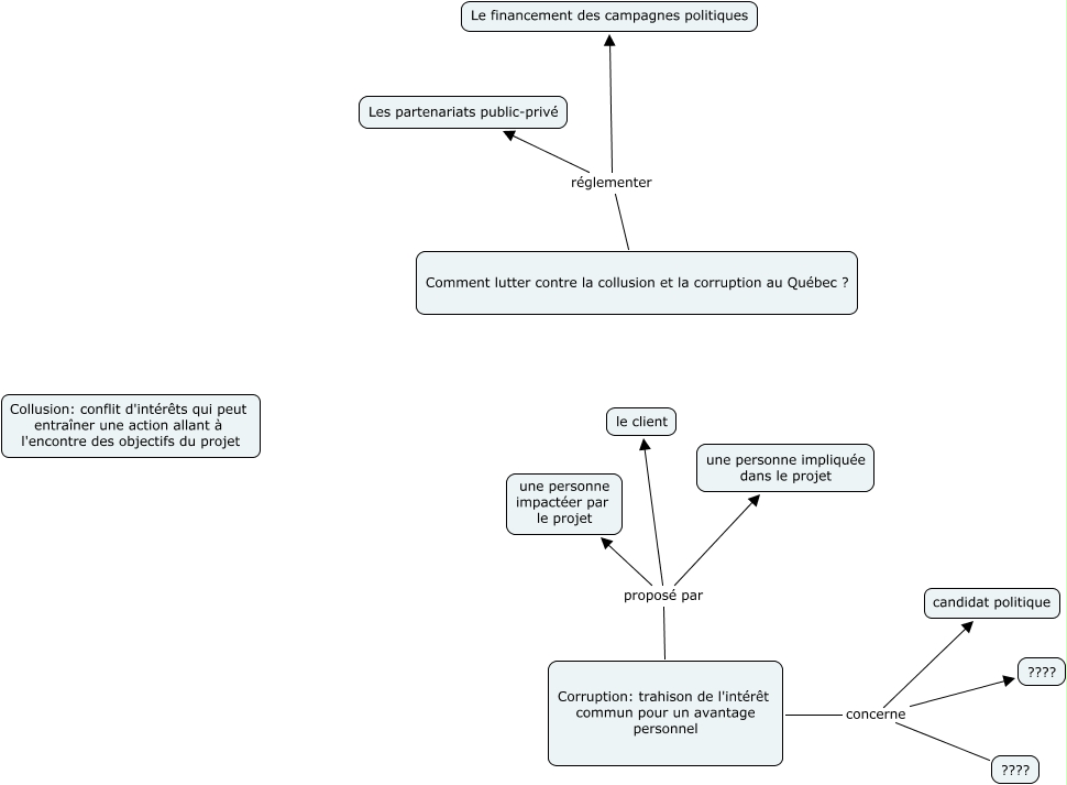 Cette carte de concepts créée avec IHMC CmapTools traite de: manon, Comment lutter contre la collusion et la corruption au Québec ? réglementer Les partenariats public-privé, Corruption: trahison de l'intérêt commun pour un avantage personnel concerne ????, Corruption: trahison de l'intérêt commun pour un avantage personnel proposé par une personne impliquée dans le projet, Corruption: trahison de l'intérêt commun pour un avantage personnel concerne candidat politique, Corruption: trahison de l'intérêt commun pour un avantage personnel proposé par une personne impactéer par le projet, Corruption: trahison de l'intérêt commun pour un avantage personnel proposé par le client, Comment lutter contre la collusion et la corruption au Québec ? réglementer Le financement des campagnes politiques, Corruption: trahison de l'intérêt commun pour un avantage personnel concerne ????