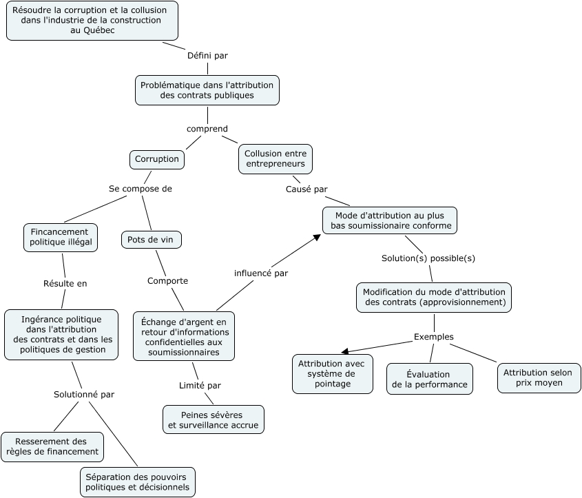 Cette carte de concepts créée avec IHMC CmapTools traite de: Mathieu Lauzon, Problématique dans l'attribution des contrats publiques comprend Collusion entre entrepreneurs, Modification du mode d'attribution des contrats (approvisionnement) Exemples Attribution avec système de pointage, Modification du mode d'attribution des contrats (approvisionnement) Exemples Attribution selon prix moyen, Fincancement politique illégal Résulte en Ingérance politique dans l'attribution des contrats et dans les politiques de gestion, Corruption Se compose de Fincancement politique illégal, Ingérance politique dans l'attribution des contrats et dans les politiques de gestion Solutionné par Resserement des règles de financement, Ingérance politique dans l'attribution des contrats et dans les politiques de gestion Solutionné par Séparation des pouvoirs politiques et décisionnels, Problématique dans l'attribution des contrats publiques comprend Corruption, Échange d'argent en retour d'informations confidentielles aux soumissionnaires influencé par Mode d'attribution au plus bas soumissionaire conforme, Pots de vin Comporte Échange d'argent en retour d'informations confidentielles aux soumissionnaires, Modification du mode d'attribution des contrats (approvisionnement) Exemples Évaluation de la performance, Échange d'argent en retour d'informations confidentielles aux soumissionnaires Limité par Peines sévères et surveillance accrue, Mode d'attribution au plus bas soumissionaire conforme Solution(s) possible(s) Modification du mode d'attribution des contrats (approvisionnement), Collusion entre entrepreneurs Causé par Mode d'attribution au plus bas soumissionaire conforme, Résoudre la corruption et la collusion dans l'industrie de la construction au Québec Défini par Problématique dans l'attribution des contrats publiques, Corruption Se compose de Pots de vin