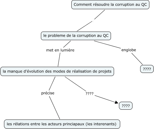 Cette carte de concepts créée avec IHMC CmapTools traite de: test Eugenio, Comment résoudre la corruption au QC le probleme de la corruption au QC, la manque d'évolution des modes de réalisation de projets précise les rélations entre les acteurs princiapaux (les interenants), le probleme de la corruption au QC englobe ????, le probleme de la corruption au QC met en lumière la manque d'évolution des modes de réalisation de projets, la manque d'évolution des modes de réalisation de projets ???? ????