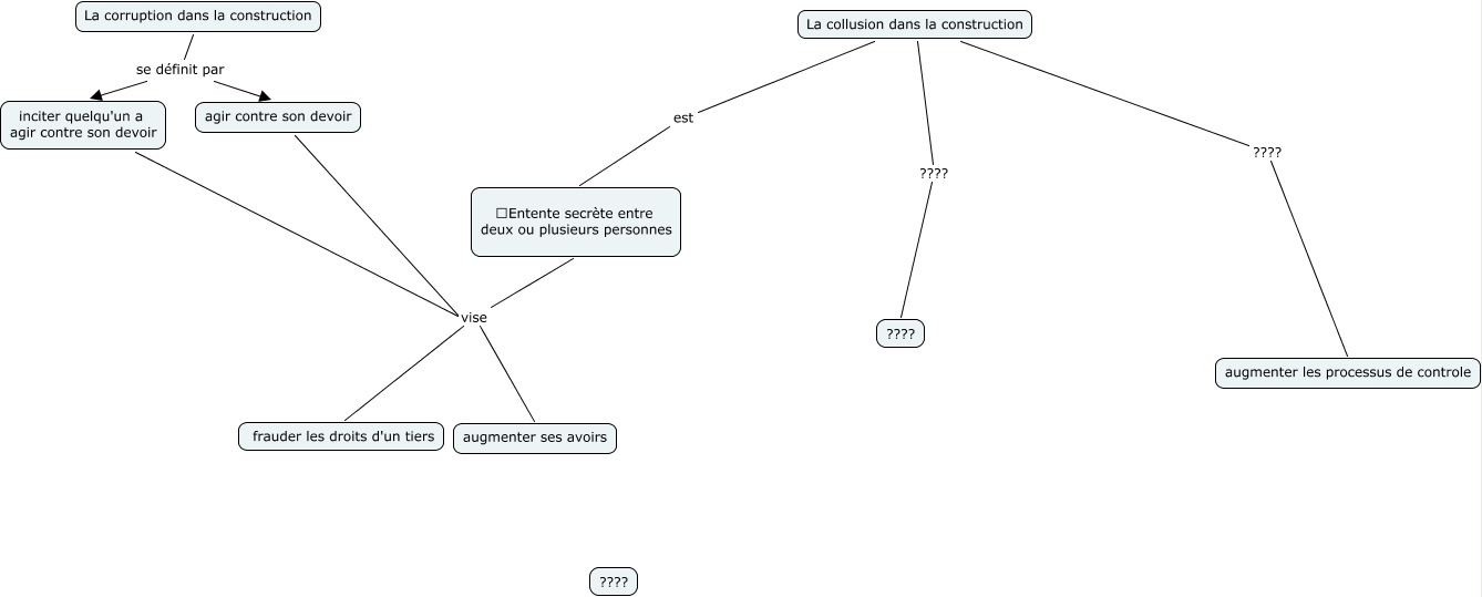 Cette carte de concepts créée avec IHMC CmapTools traite de: test MD, ◾Entente secrète entre deux ou plusieurs personnes vise frauder les droits d'un tiers, inciter quelqu'un a agir contre son devoir vise frauder les droits d'un tiers, agir contre son devoir vise augmenter ses avoirs, ◾Entente secrète entre deux ou plusieurs personnes vise augmenter ses avoirs, La collusion dans la construction ???? augmenter les processus de controle, La collusion dans la construction ???? ????, La collusion dans la construction est ◾Entente secrète entre deux ou plusieurs personnes, agir contre son devoir vise frauder les droits d'un tiers, inciter quelqu'un a agir contre son devoir vise augmenter ses avoirs, La corruption dans la construction se définit par agir contre son devoir, La corruption dans la construction se définit par inciter quelqu'un a agir contre son devoir