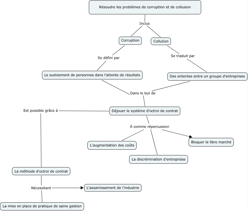 Cette carte de concepts créée avec IHMC CmapTools traite de: GLachance, Déjouer le système d'octroi de contrat Est possible grâce à La méthode d'octroi de contrat, Des ententes entre un groupe d'entreprises Dans le but de Déjouer le système d'octroi de contrat, La méthode d'octroi de contrat Nécessitant La mise en place de pratique de saine gestion, Déjouer le système d'octroi de contrat À comme répercussion Bloquer le libre marché, Corruption Se défini par Le sudoiement de personnes dans l'attente de résultats, La méthode d'octroi de contrat Nécessitant L'assainissement de l'industrie, Le sudoiement de personnes dans l'attente de résultats Dans le but de Déjouer le système d'octroi de contrat, Collution Se traduit par Des ententes entre un groupe d'entreprises, Résoudre les problèmes de corruption et de collusion Inclus Corruption, Résoudre les problèmes de corruption et de collusion Inclus Collution, Déjouer le système d'octroi de contrat À comme répercussion L'augmentation des coûts, Déjouer le système d'octroi de contrat À comme répercussion La discrémination d'entreprsise