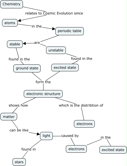This Concept Map, created with IHMC CmapTools, has information related to: Chemistry and Cosmic Evolution, periodic table are stable, stable found in the ground state, light caused by electrons, Chemistry relates to Cosmic Evolution since atoms, electrons in the excited state, atoms in the periodic table, electronic structure shows how matter, matter can be like light, periodic table are unstable, electronic structure which is the distribtion of electrons, excited state form the electronic structure, light found in stars, ground state form the electronic structure, unstable found in the excited state