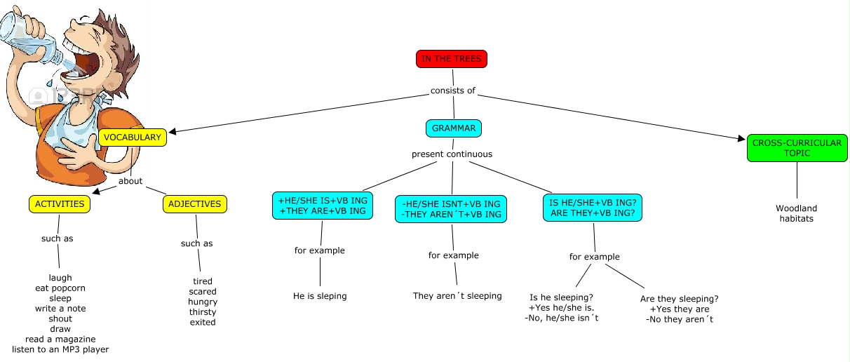 Este Cmap, tiene información relacionada con: AT THE TREES-Joaquín, IN THE TREES consists of CROSS-CURRICULAR TOPIC, CROSS-CURRICULAR TOPIC ???? Woodland habitats, -HE/SHE ISNT+VB ING -THEY AREN´T+VB ING for example They aren´t sleeping, IN THE TREES consists of GRAMMAR, IS HE/SHE+VB ING? ARE THEY+VB ING? for example Is he sleeping? +Yes he/she is. -No, he/she isn´t, GRAMMAR present continuous IS HE/SHE+VB ING? ARE THEY+VB ING?, IN THE TREES consists of VOCABULARY, VOCABULARY about ADJECTIVES, IS HE/SHE+VB ING? ARE THEY+VB ING? for example Are they sleeping? +Yes they are -No they aren´t, VOCABULARY about ACTIVITIES, GRAMMAR present continuous +HE/SHE IS+VB ING +THEY ARE+VB ING, +HE/SHE IS+VB ING +THEY ARE+VB ING for example He is sleping, GRAMMAR present continuous -HE/SHE ISNT+VB ING -THEY AREN´T+VB ING, ADJECTIVES such as tired scared hungry thirsty exited, ACTIVITIES such as laugh eat popcorn sleep write a note shout draw read a magazine listen to an MP3 player