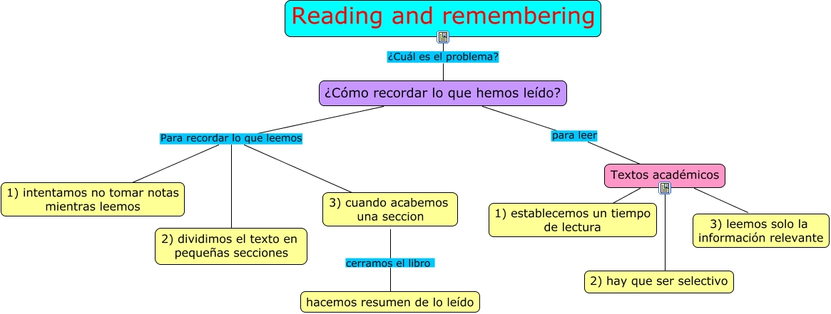 Este Cmap, tiene información relacionada con: Sin Título 1, ¿Cómo recordar lo que hemos leído? Para recordar lo que leemos 2) dividimos el texto en pequeñas secciones, ¿Cómo recordar lo que hemos leído? para leer Textos académicos, Textos académicos ???? 3) leemos solo la información relevante, Textos académicos ???? 2) hay que ser selectivo, Textos académicos ???? 1) establecemos un tiempo de lectura, ¿Cómo recordar lo que hemos leído? Para recordar lo que leemos 1) intentamos no tomar notas mientras leemos, ¿Cómo recordar lo que hemos leído? Para recordar lo que leemos 3) cuando acabemos una seccion, Reading and remembering ¿Cuál es el problema? ¿Cómo recordar lo que hemos leído?, 3) cuando acabemos una seccion cerramos el libro hacemos resumen de lo leído
