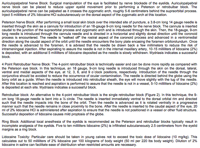 auricopalpebral nerve block.jpg Auricopalpebral Video on Calf.url Enucleation.url eye enucleation.JPG Eye Enucleation.cmap Eye Enucleation on Horse with Instructions.url Eye Enucleation - Start to Finish.url Four Point Block.jpg Peterson Nerve Block.jpg Screen Shot 2014-11-03 at 6.01.54 PM.png Screen Shot 2014-11-03 at 6.11.25 PM.png Screen Shot 2014-11-03 at 6.21.46 PM.png Screen Shot 2014-11-03 at 6.37.58 PM.png Screen Shot 2014-11-03 at 6.40.12 PM.png Screen Shot 2014-11-03 at 6.42.03 PM.png Screen Shot 2014-11-03 at 6.48.52 PM.png Screen Shot 2014-11-03 at 6.51.54 PM.png Screen Shot 2014-11-03 at 6.52.46 PM.png subconjuctival enucleation.jpg Transpalp Surgical Video No instructions.url