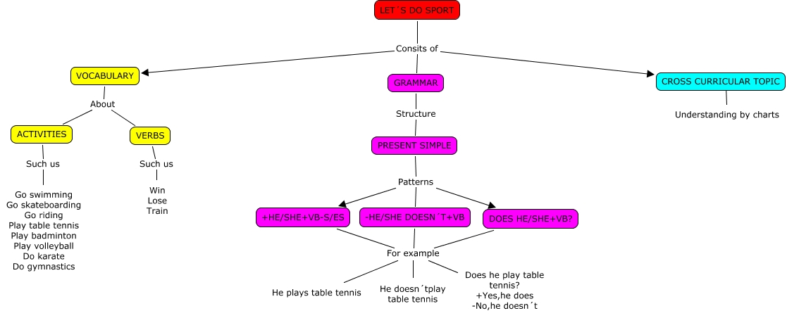Este Cmap, tiene información relacionada con: LET´S DO SPORT-Migue lJaureguízar, +HE/SHE+VB-S/ES For example He doesn´tplay table tennis, ACTIVITIES Such us Go swimming Go skateboarding Go riding Play table tennis Play badminton Play volleyball Do karate Do gymnastics, GRAMMAR Structure PRESENT SIMPLE, LET´S DO SPORT Consits of CROSS CURRICULAR TOPIC, DOES HE/SHE+VB? For example Does he play table tennis? +Yes,he does -No,he doesn´t, -HE/SHE DOESN´T+VB For example Does he play table tennis? +Yes,he does -No,he doesn´t, DOES HE/SHE+VB? For example He doesn´tplay table tennis, LET´S DO SPORT Consits of GRAMMAR, -HE/SHE DOESN´T+VB For example He doesn´tplay table tennis, PRESENT SIMPLE Patterns -HE/SHE DOESN´T+VB, PRESENT SIMPLE Patterns DOES HE/SHE+VB?, VOCABULARY About VERBS, DOES HE/SHE+VB? For example He plays table tennis, +HE/SHE+VB-S/ES For example He plays table tennis, CROSS CURRICULAR TOPIC ???? Understanding by charts, VOCABULARY About ACTIVITIES, PRESENT SIMPLE Patterns +HE/SHE+VB-S/ES, +HE/SHE+VB-S/ES For example Does he play table tennis? +Yes,he does -No,he doesn´t, LET´S DO SPORT Consits of VOCABULARY, VERBS Such us Win Lose Train